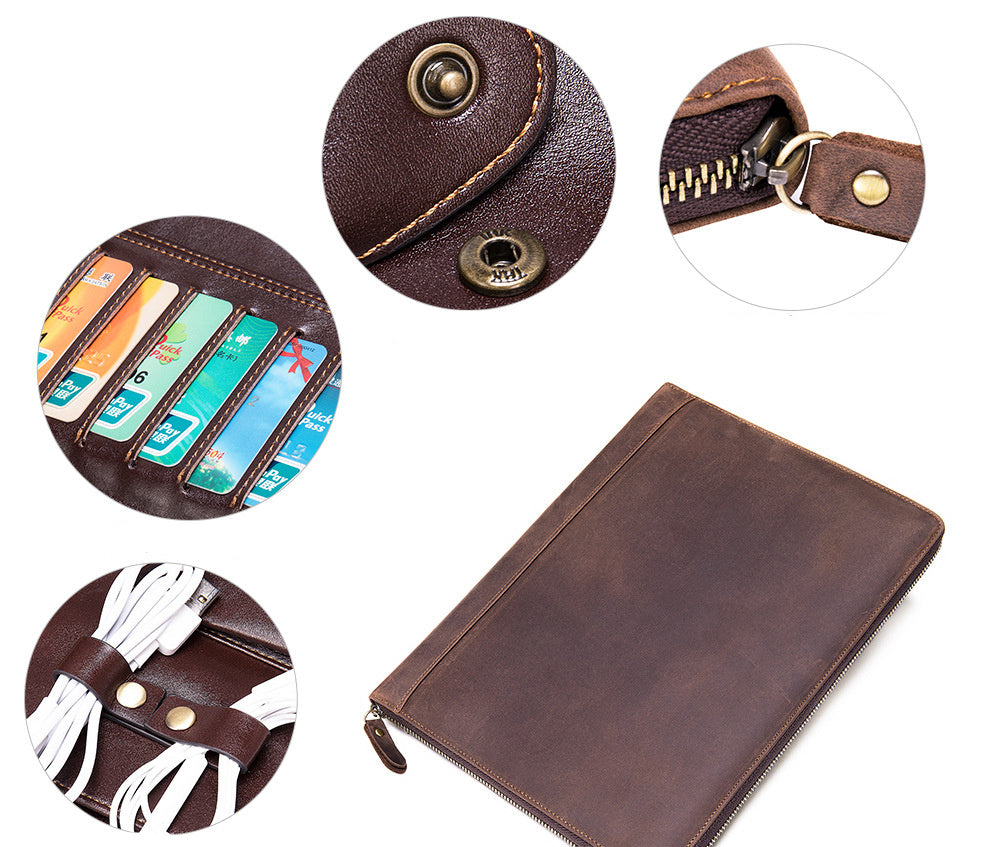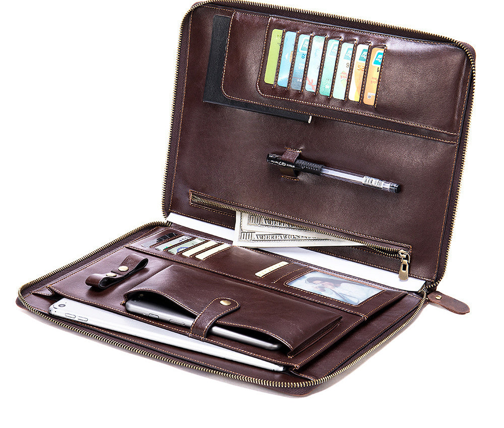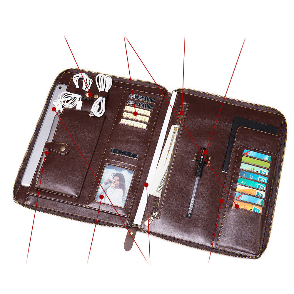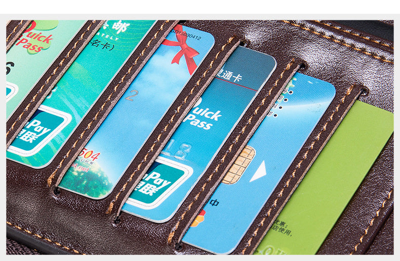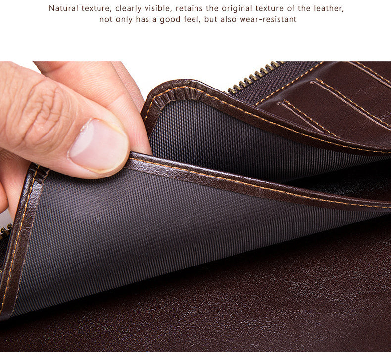 Product Category: Card Holder Opening method: zipper Material: Leather Small bag internal structure: bill holder, photo slot, change slot, zipper compartment, card slot Applicable gender: male Style: European and American style Color: coffee Size: 24x2x31CM (length x thickness x height) Weight: 0.7KG
