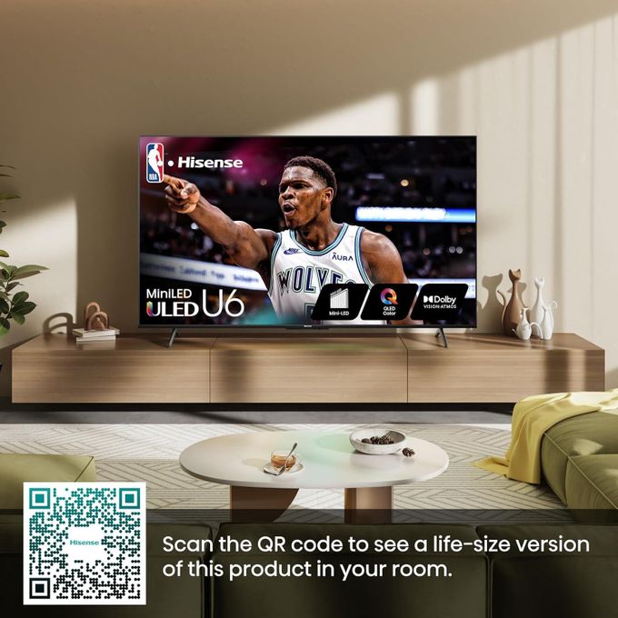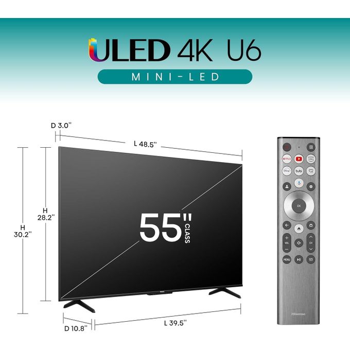 Experience stunning visuals with the Hisense 55 Inch U6 Pro Series Mini-LED ULED UHD 4K Smart TV. Its Mini-LED and Quantum Dot technology deliver vibrant colors and exceptional brightness, while Dolby Vision IQ and HDR10+ enhance every scene with rich contrast. Enjoy smooth gameplay with Game Mode Plus and crisp 4K resolution. The VIDAA U7.6 smart platform offers effortless control with voice assistant, Apple AirPlay, and screen mirroring. With powerful 20W Dolby Atmos audio and extensive connectivity options, this sleek black TV combines superior performance with smart convenience, all backed by a 3-year warranty.