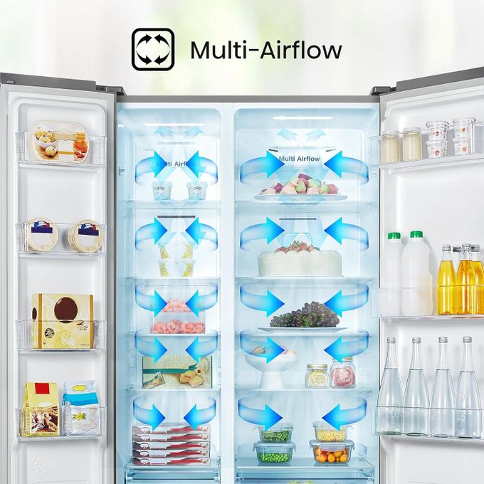 Experience the perfect blend of style and efficiency with the Hisense 560 Liters Side By Side Refrigerator RC-56WS4S2. Featuring A+ energy savings and intelligent temperature control, it keeps your food fresh longer while reducing power use. The spacious 561-liter capacity, adjustable shelves, vegetable compartment, and ice maker accommodate all your storage needs. Fast cool and freeze functions ensure quick chilling, while the sleek silver steel finish complements any kitchen. With total no frost technology, multi-air flow system, and user-friendly LED touch controls, this refrigerator delivers convenience and performance backed by a 3-year warranty.