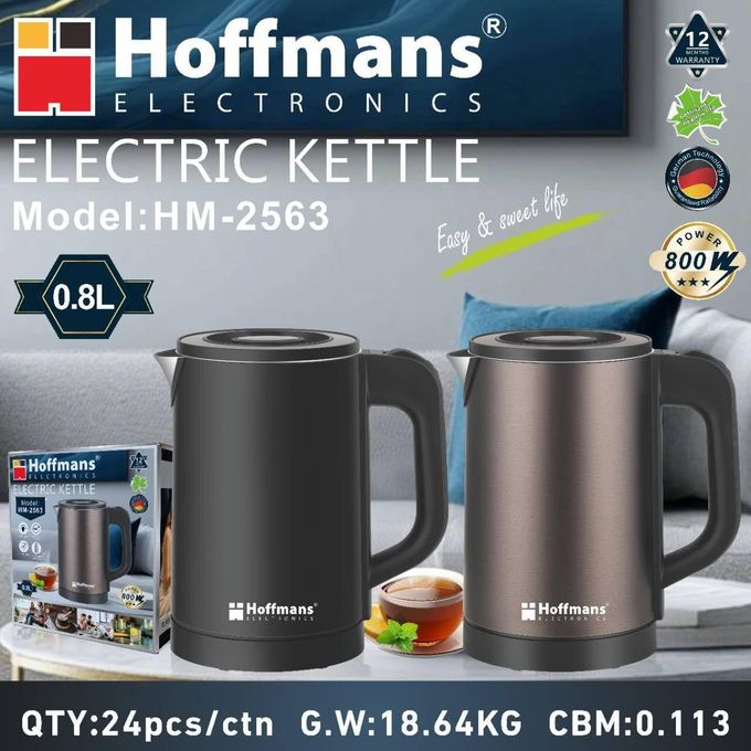 The Hoffmans HM-2563 delivers German-engineered reliability in a sleek, space-saving design. This 0.8L compact kettle boils water in seconds with its powerful 800W heating element, perfect for quick cups of tea, coffee, or instant meals. The double-wall stainless steel construction keeps the exterior cool while maintaining heat efficiency, and the 360° cordless base offers convenient pouring from any angle. Automatic shut-off and boil-dry protection ensure safe, worry-free operation every time. Available in sophisticated Black or Bronze finishes, it's the ideal kettle for modern kitchens where style meets functionality.