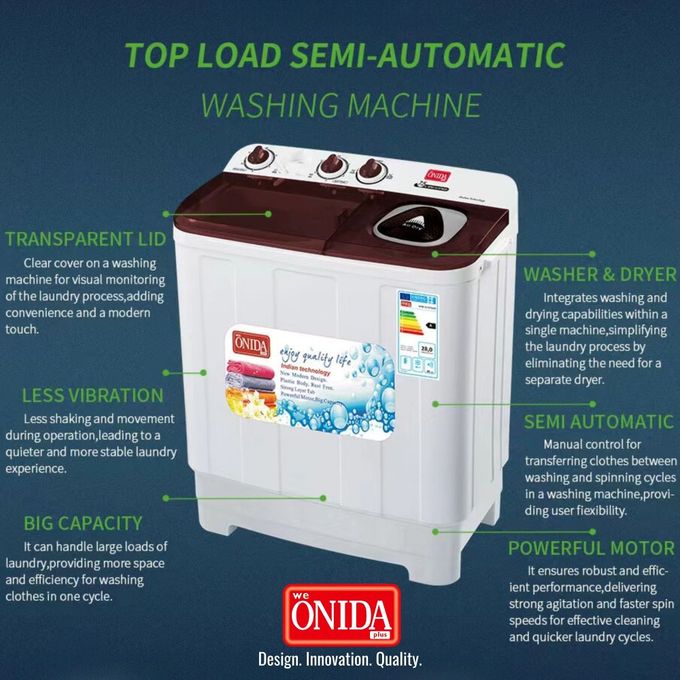 The Onida Plus 7.5kg Twin Tub Washing Machine features a semi-automatic top load design with separate electric washer and drain tubs, enabling efficient washing and drying cycles controlled by individual timers. Its 7.5kg capacity suits medium-sized laundry loads, while the integrated drain pump facilitates hassle-free water removal. This classic, durable model offers reliable performance and ease of use, making it an expert choice for practical laundry needs.