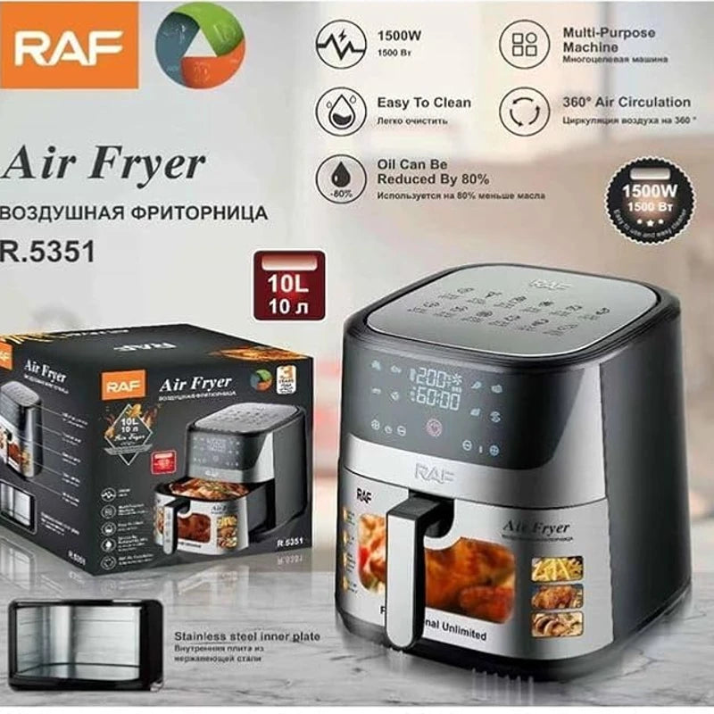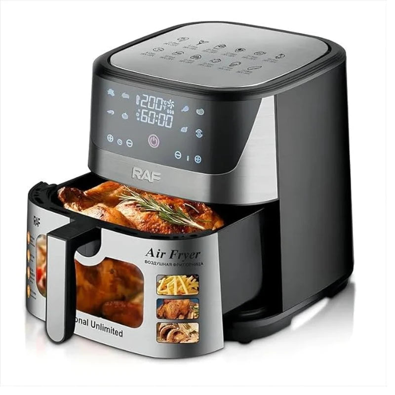 The RAF Essential Air Fryer brings restaurant-quality cooking to your kitchen with its impressive 10-liter capacity and powerful 1500W performance. This versatile appliance masters fry, bake, grill, and roast functions, while preset programs take the guesswork out of meal preparation. The digital touch screen offers precise temperature control from 80°C to 200°C with a convenient 60-minute timer. Its non-stick removable basket makes cleanup effortless, and built-in safety features including overheat protection and auto shut-off provide peace of mind. Crafted from durable plastic and metal construction with a cool-touch handle, this black powerhouse comes complete with a recipe book and accessories to jumpstart your culinary adventures.