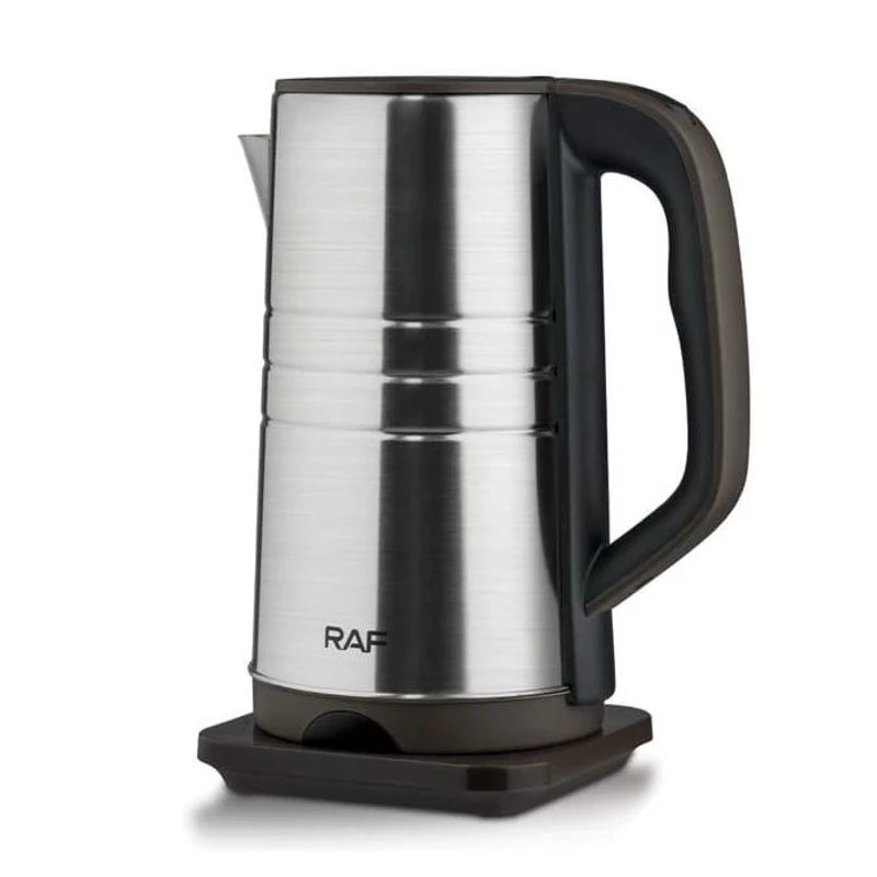 The RAF R7808 electric kettle brings efficiency and style to your kitchen with its impressive 3.5-liter capacity and powerful 2000W heating element. Crafted from premium stainless steel with sleek black accents, this kettle boils water rapidly—perfect for busy families and entertaining guests. Safety features include automatic shut-off and boil-dry protection, while the cool-touch handle ensures worry-free operation. The concealed heating element simplifies cleaning, and the removable filter adds convenience. With a 360-degree swivel base, integrated cord storage, and an external water level indicator, every detail enhances usability. Its modern design complements any kitchen aesthetic while delivering reliable, energy-efficient performance you can depend on daily.