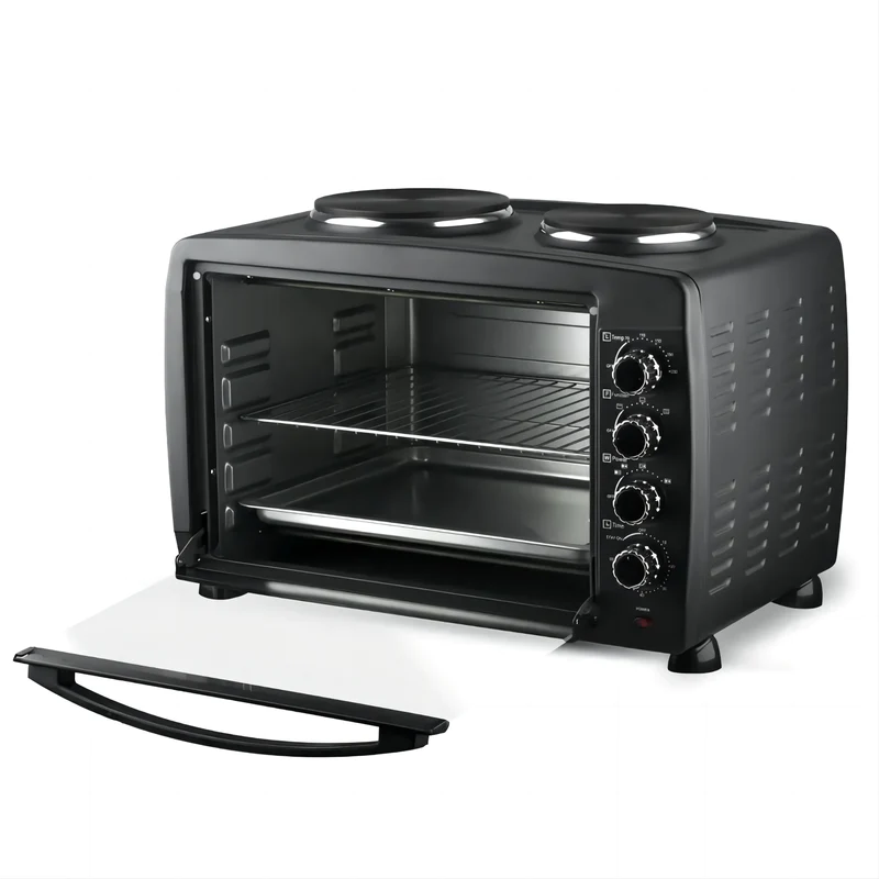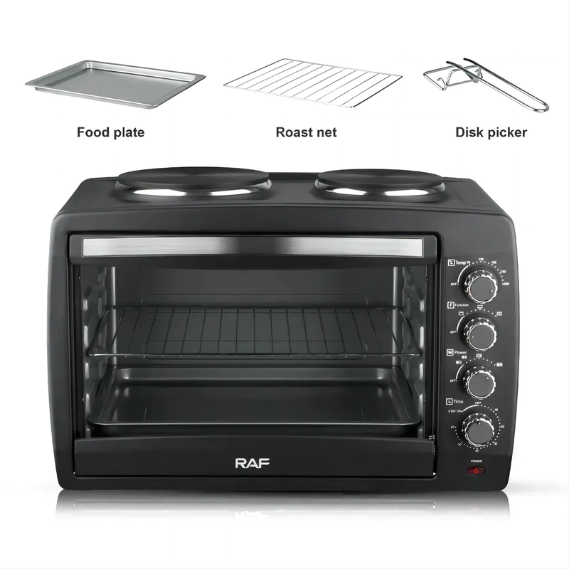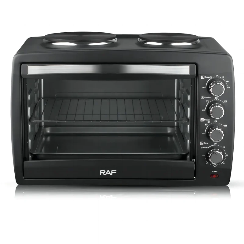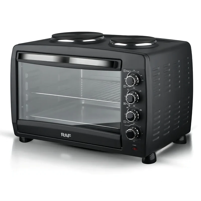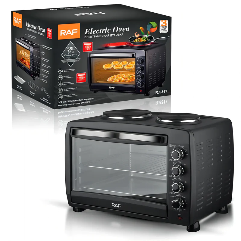 The RAF 55L Electric Oven with 2 Hotplates combines compact efficiency with versatile cooking power. Featuring dual stovetop burners and a spacious 55-liter oven cavity, this unit delivers multiple cooking methods including baking, broiling, rotisserie, and convection—all in one sleek appliance. The visual glass door lets you monitor your dishes without opening, while precise temperature control and a 60-minute timer ensure perfectly cooked meals every time. Ideal for kitchens with limited space, this multi-functional cooker maximizes your cooking capabilities without compromising on performance or style.