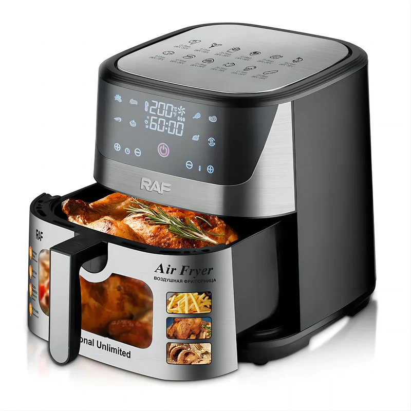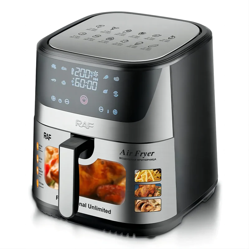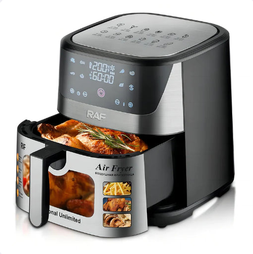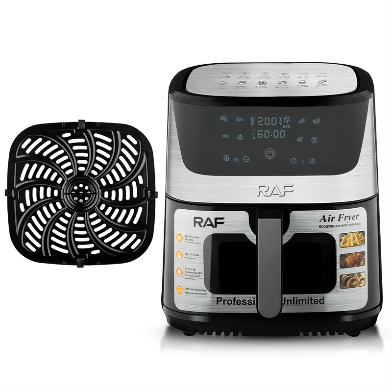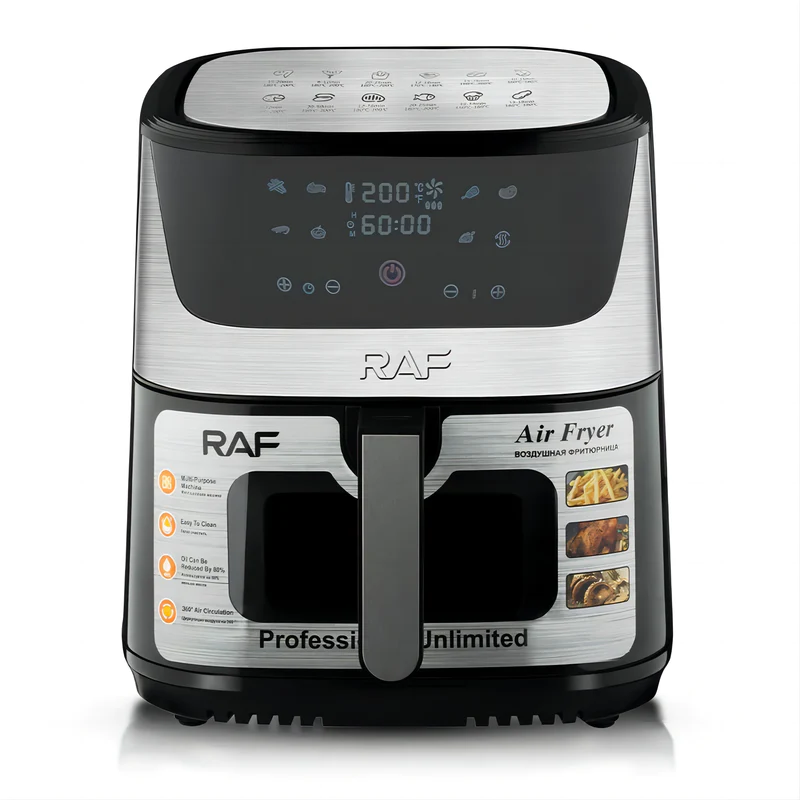 Experience healthier cooking with the RAF 8L Digital Air Fryer. This stainless steel powerhouse uses advanced air circulation technology to deliver crispy, delicious meals with minimal oil. The intuitive digital touch control panel lets you adjust temperature and time effortlessly, while the 60-minute timer ensures perfect results every time. The detachable non-stick basket and dishwasher-safe accessories make cleanup a breeze. Safety features include overheat protection and a cool-touch handle. Rated at 1300W with 220V compatibility, this versatile fryer transforms your kitchen into a healthier cooking space without compromising on taste or convenience.