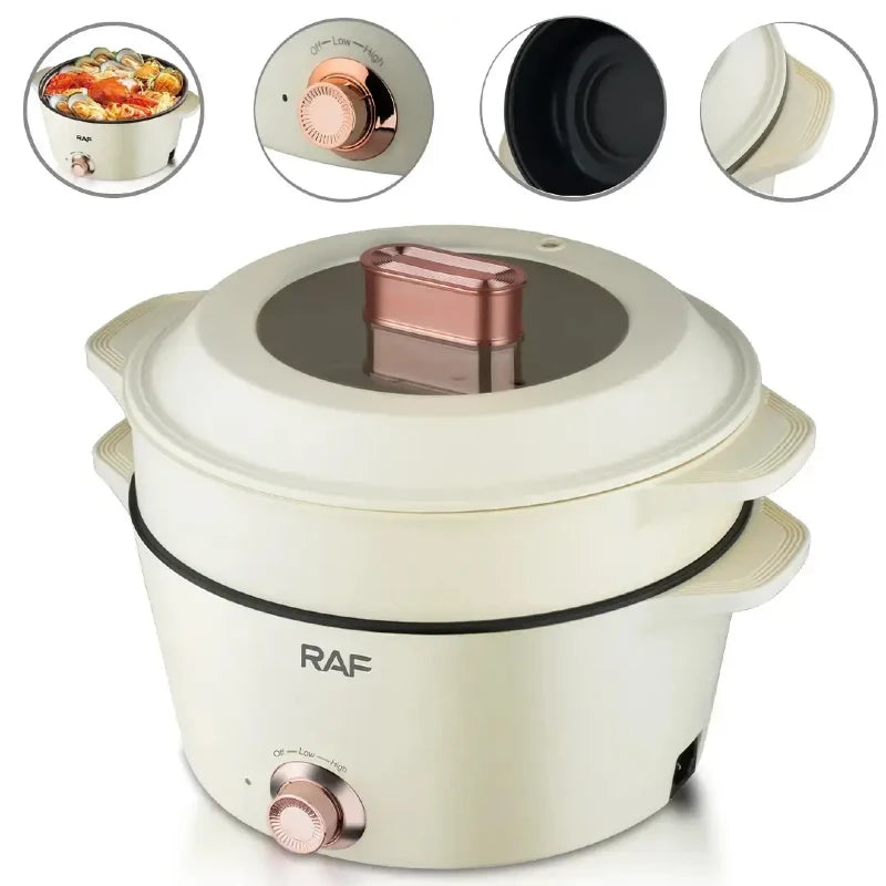 Experience dual-pot convenience with the RAF Electric Hot Pot R.5403, featuring impressive 7-liter and 5-liter capacities perfect for family meals and entertaining. Powered by 1300W of efficient heating, this versatile cooker delivers adjustable temperature control for precise cooking every time. The non-stick coated pots make cleanup effortless, while tempered glass lids with steam vents let you monitor your food without lifting. Ergonomic heat-resistant handles and a non-slip base ensure safe, comfortable use. Built with overheat protection and BPA-free materials, it's the reliable kitchen companion that combines performance with peace of mind. Compact and lightweight design fits seamlessly into any kitchen space.