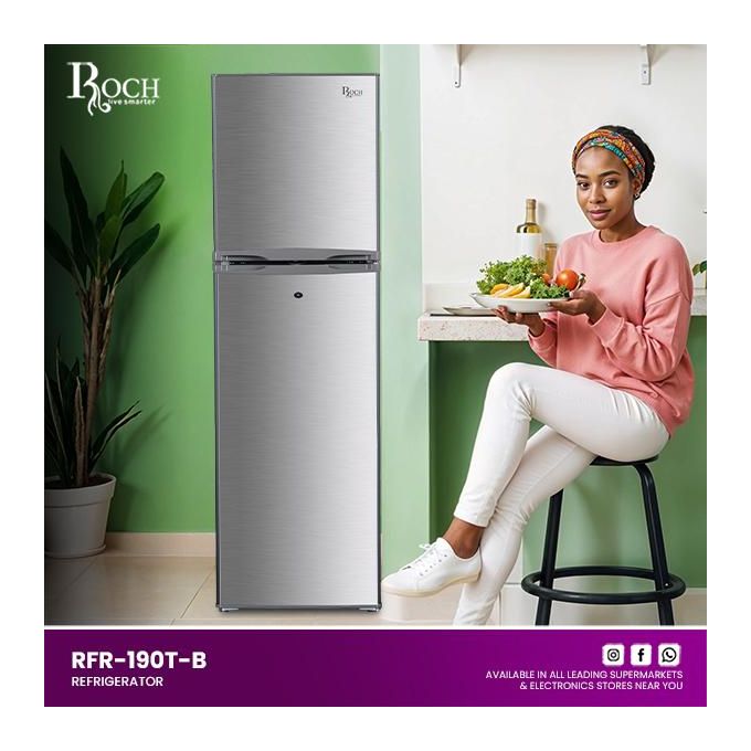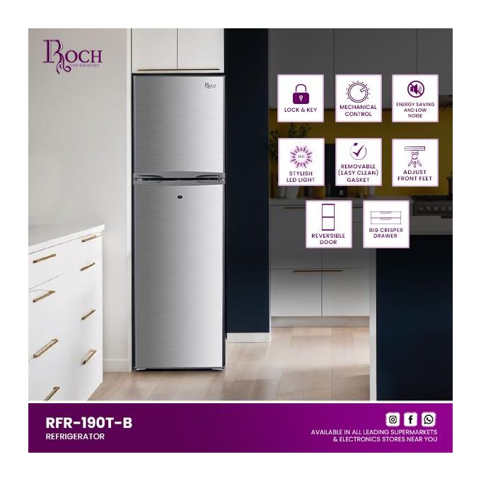 The Roch 190-liter double-door refrigerator combines practical design with reliable performance. Featuring a top freezer compartment with automatic defrost, this energy-efficient appliance keeps your food fresher while reducing electricity costs. The stylish LED lighting illuminates your contents clearly, while the reversible door adapts to your kitchen layout. Mechanical controls offer straightforward operation, and the removable gasket makes cleaning effortless. Built with durable construction and backed by a 2-year warranty, this silver-finish fridge delivers excellent value for everyday household needs.