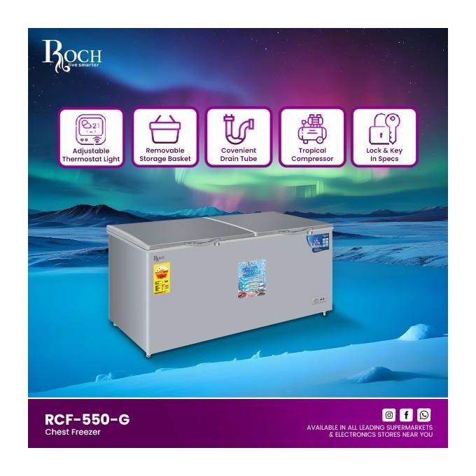 Keep your frozen goods perfectly preserved with the Roch 550L Defrost Deep Freezer. This robust chest freezer features a sliding glass top for easy visibility and access, paired with a powerful compressor that operates whisper-quiet. The interior aluminum construction ensures durability, while the built-in LED light lets you find items instantly. Convenient features include automatic defrost technology, a secure lock with key, one storage basket, and smooth-rolling wheels for effortless repositioning. Ideal for households and small businesses needing reliable, long-term food storage.