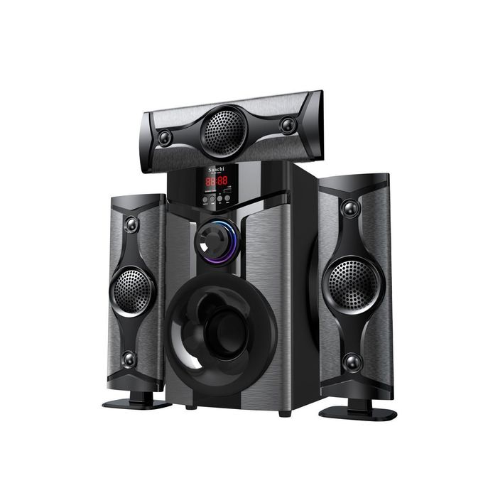 Experience immersive audio with the Saachi 3.1 Channel Multimedia Speaker System, engineered for powerful bass and crystal-clear sound. This versatile system connects seamlessly via Bluetooth, USB, SD, AUX, or FM, adapting to your preferred audio source. The sleek black and silver metallic design complements any space while delivering room-filling performance. Control your music effortlessly with the included remote, and monitor settings on the LED digital display. Perfect for home entertainment, gaming, or everyday listening—premium sound quality that transforms your audio experience.