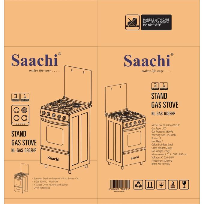 Transform your cooking experience with the Saachi NL-6362HP. Featuring a sleek and modern design in striking black and silver, this 3 gas and 1 electric cooker with a gas oven (50X50cm) offers convenience, efficiency, and versatility. Whether you're boiling, frying, baking, or grilling, this cooker will meet all your culinary needs with ease. The gas burners provide precise temperature control, while the spacious gas oven ensures even heat distribution for perfectly cooked dishes every time. With easy-to-clean surfaces and integrated safety features, such as flame failure protection, this cooker makes meal preparation both effortless and safe. Don't wait any longer, add this efficient and stylish cooker to your kitchen today!