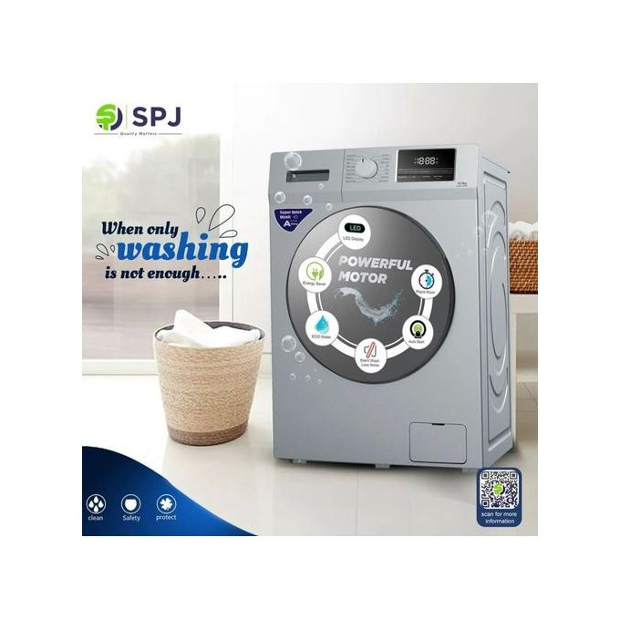 The SPJ 10Kg Front Load Washing Machine combines power and elegance in a sophisticated grey design. With 16 versatile programs and A+++ energy efficiency, it dramatically reduces your utility bills while handling your family's laundry needs.