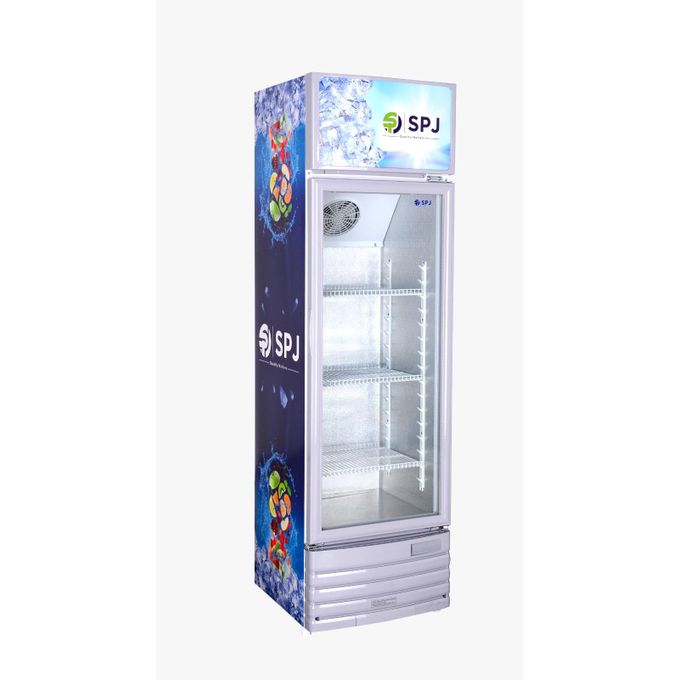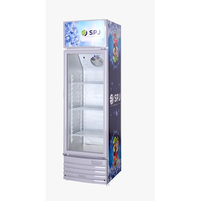 Experience the premium SPJ 300L Showcase Chiller, a sleek single-door beverage cooler with mechanical temperature control and adjustable thermostat.
