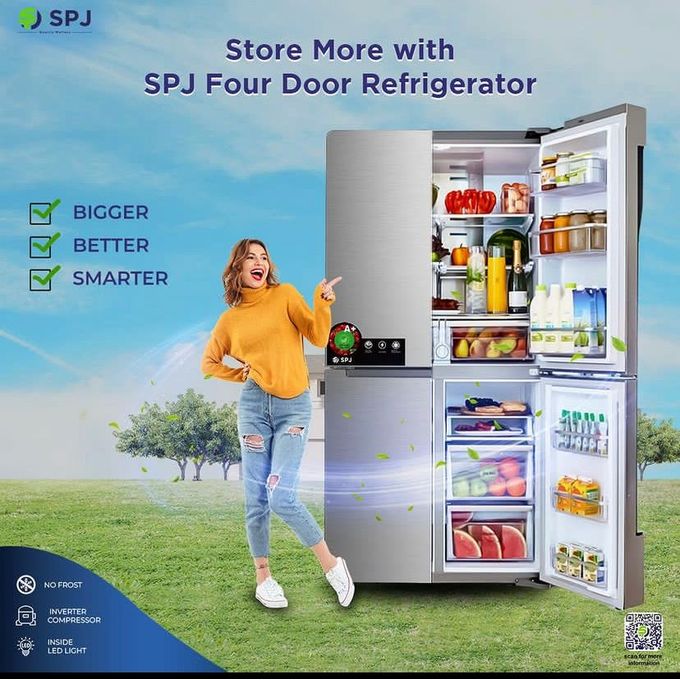 Experience luxury cooling with the SPJ 559L 4-Door Refrigerator in elegant black glass finish. This American-style marvel combines style with functionality, featuring Triple Zone Cooling technology and a convenient water dispenser.