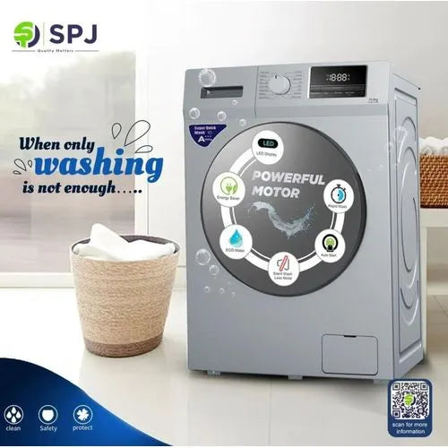 Experience superior laundry care with the SPJ 8Kg Front Load Fully Automatic Washing Machine. Engineered with 16 versatile wash programs and a powerful 1200 rpm spin speed, it tackles any fabric type effortlessly. The innovative Snowflake Drum protects your clothes while the Drum Self Clean feature maintains hygiene. Save time with Super Quick Wash and money with A+++ energy efficiency. Features include intelligent LED display, Delay End scheduling, Smart Spin Balance control, and an ergonomic 45-degree handle design. Transform your laundry routine with cutting-edge technology that combines performance, protection, and efficiency in one reliable machine.