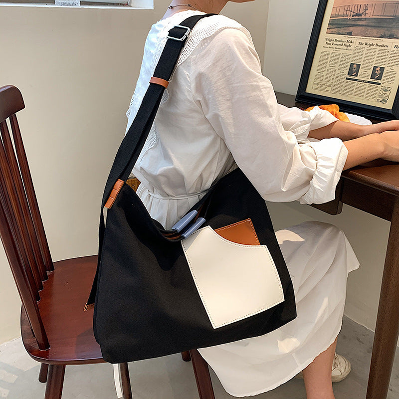 Product information: Color: white, khaki, green, black Style: Cross-border trend Material: Canvas Trendy Bags Style: Tote Bag Bag size: large Popular elements: color contrast Inventory type: whole order Lining texture: canvas Bag shape: horizontal square type Opening method: open pattern: plain Strap root number: single Package: Canvas bag x1