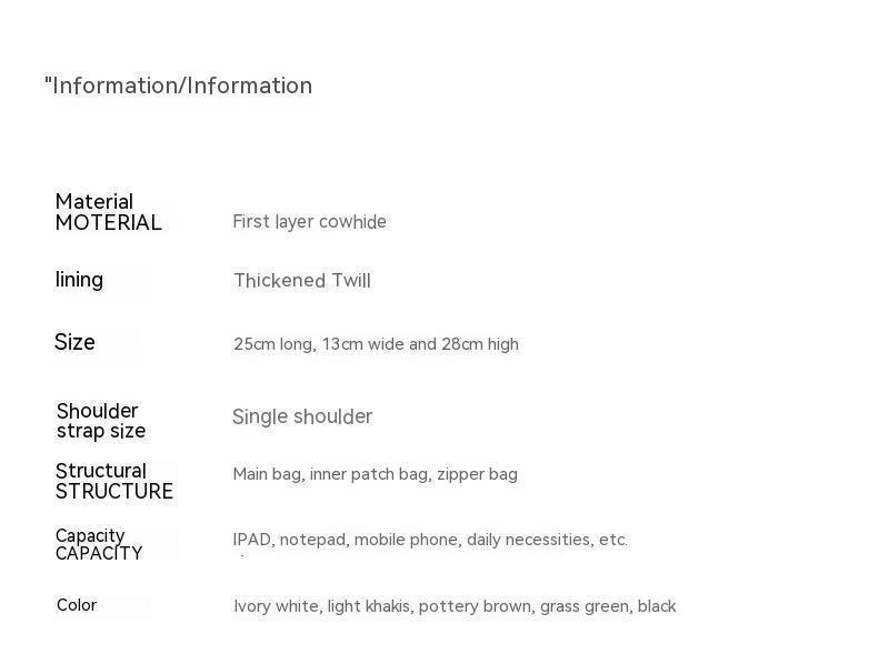 Product information: Lining texture: polyester cotton Applicable scenario: Daily configuration Color: Ivory White, tolsom brown, light khaki, grass green, black Outer bag type: open pocket Leather features: first layer cowhide Hardness: soft Material: genuine leather Suitcase shape: bucket type Bag internal structure: zipper replacement bag, file bag, sandwich zipper bag Popular elements: sewing thread Style: Urban Simplicity Number of shoulder straps: Single