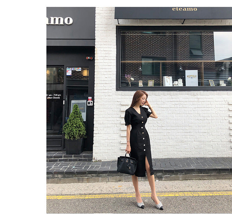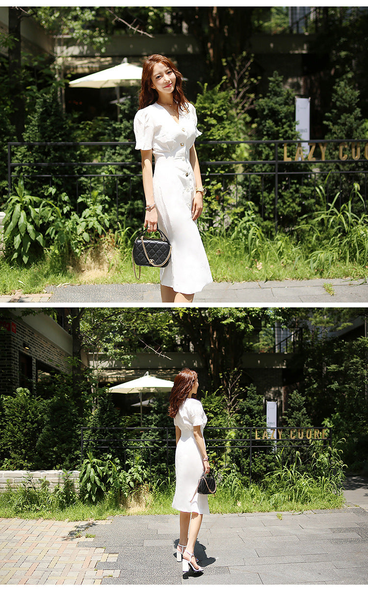 Style: Ladies pattern: plain Skirt length: mid-length skirt Collar type: V-neck Sleeve type: conventional sleeve sleeve length: short sleeve Waist type: high waist Clothing placket: single breasted Fabric name: polyester fiber Main fabric composition: polyester fiber (polyester) The content of the main fabric ingredient: 30%-50% 1. Asian sizes are 1 to 2 sizes smaller than European and American people. Choose the larger size if your size between two sizes. Please allow 2-3cm differences due to manual measurement.