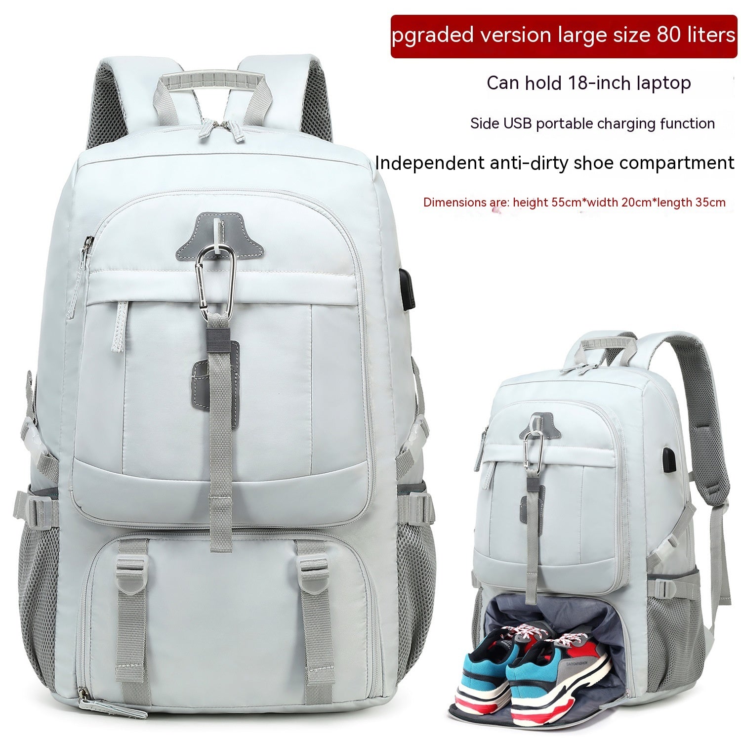 Product information: Lining texture: Polyester Applicable scenario: leisure travel Color: Black-80 liters, peacock green-80 liters, silver gray-80 liters, light blue color-80 liters Applicable gender: neutral/both men and women Leather features: Composite cowhide Function: USB interface Size: 55*20*35 Material: Oxford cloth Bearing system: Curved shoulder strap Popular elements: stitching, contrast color, lock Style: business commute Capacity: 56-75l