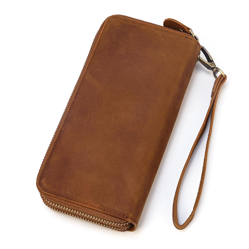 [style]: long wallet, clutch bag, hand bag, vertical [Material]: the first layer of cowhide [Size]: 19cm (length) x 9.5cm (width) x 3.5cm (thickness) [manual measurement, 0.5-1.0cm error is normal range] [Structure]: cash position * 4 (can be placed on the phone), zipper bag * 2 (can be loaded with coins), card position * 24, [Hint]: Crazy horse skin craft belongs to oil-impregnated cowhide. In order to preserve the originality and naturalness of the skin, there may be color difference in each batch of products. Please contact customer service before purchasing.