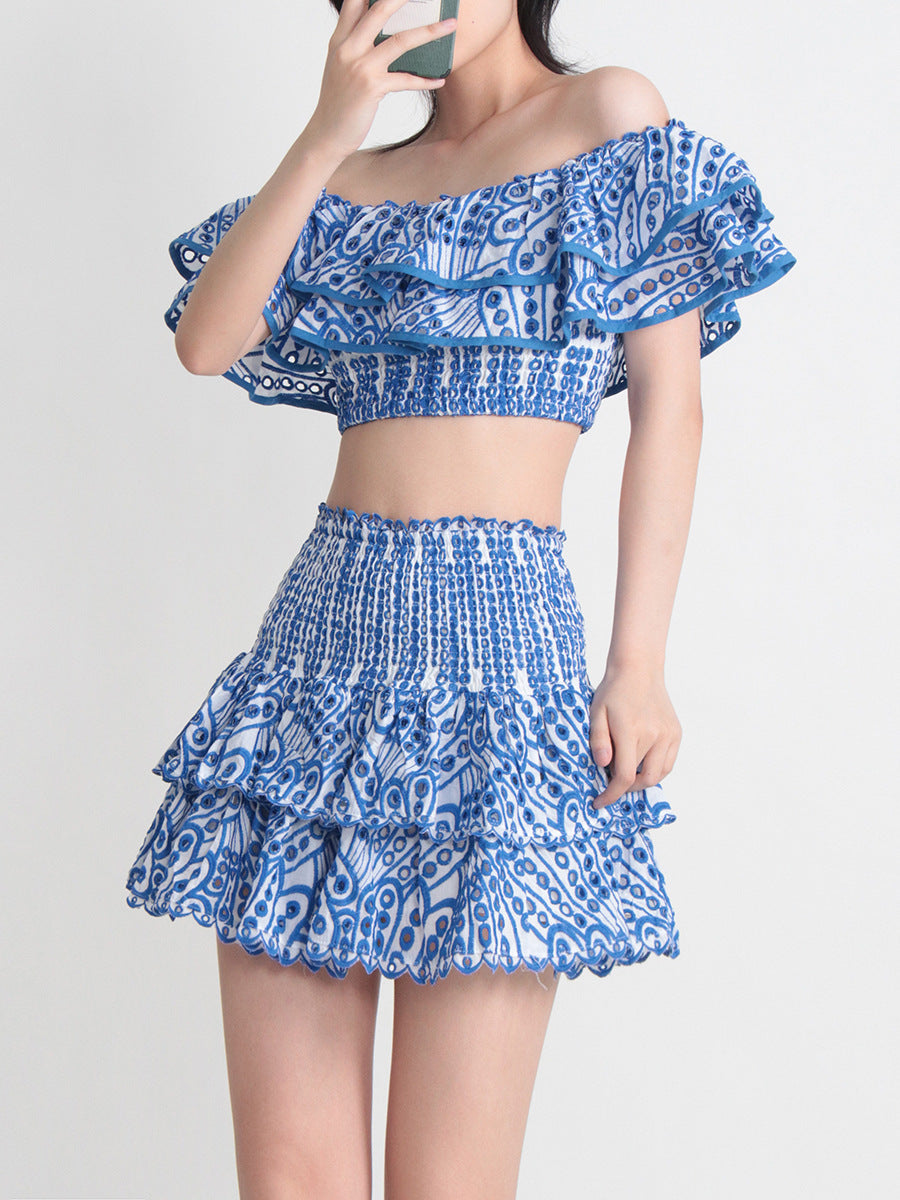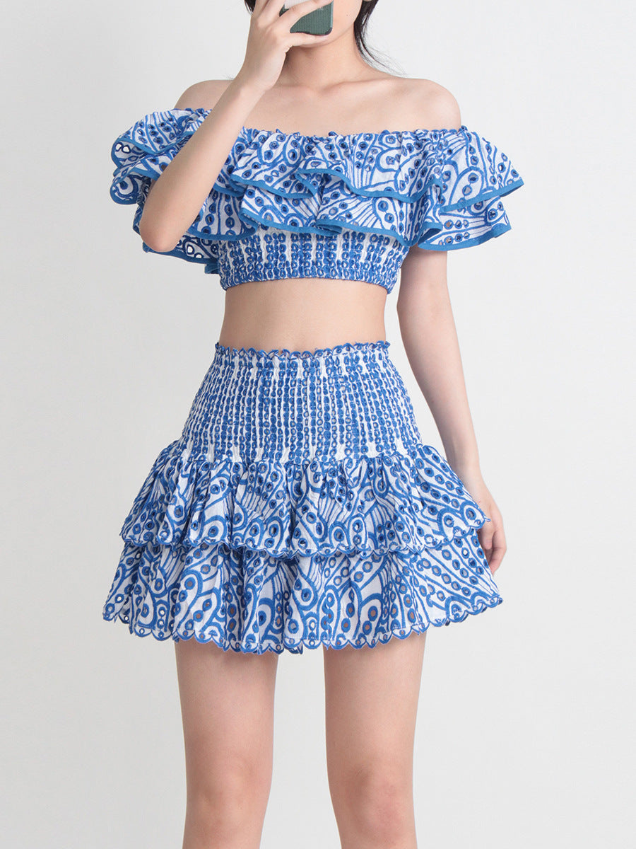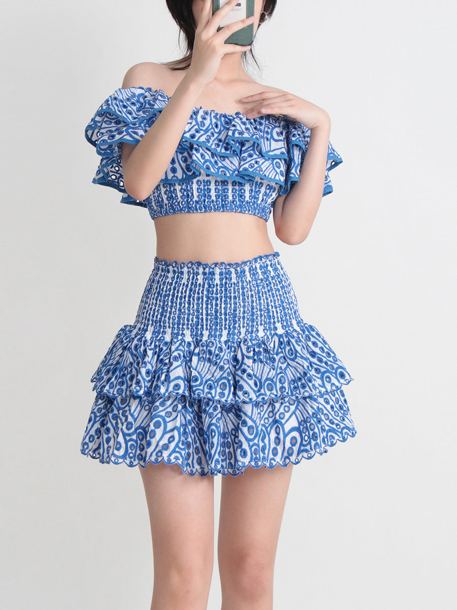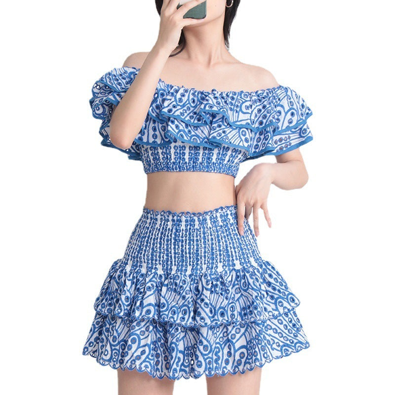 Seaside Vacation Style Two-piece Collar Short Ruffled Shirt High Waist Skirt Outfit