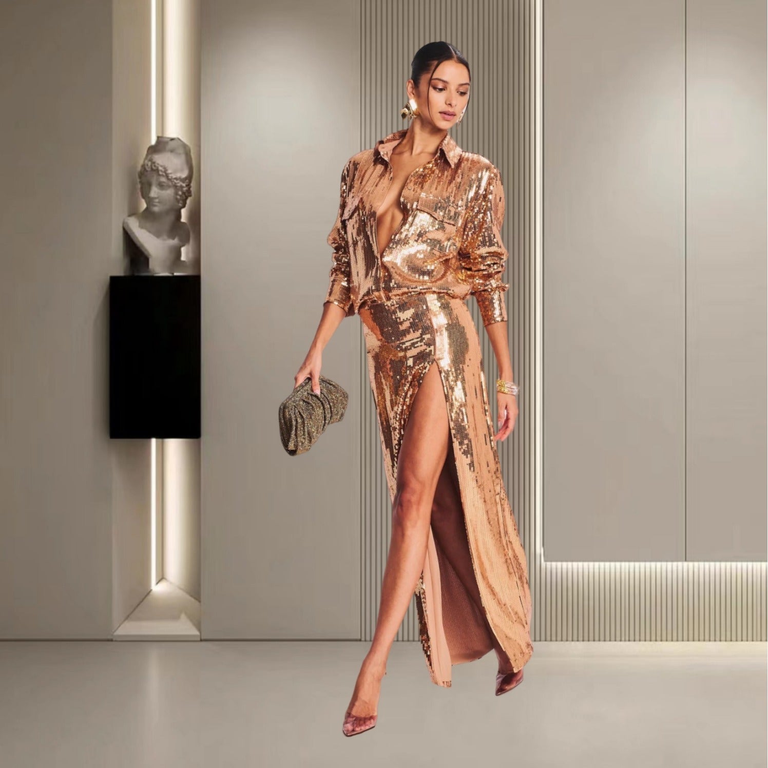 Product information: Pattern: solid color Fabric name: Polyester Color: gold, red Sleeve type: regular sleeve Main fabric composition: Polyester (polyester fiber) Size: S,M,L,XL Applicable Gender: Female Style type: private clothing socialite Skirt length: mid-length skirt Sleeve length: long sleeve Popular elements: Sequins Style: Socialite style Craft: collage/stitching