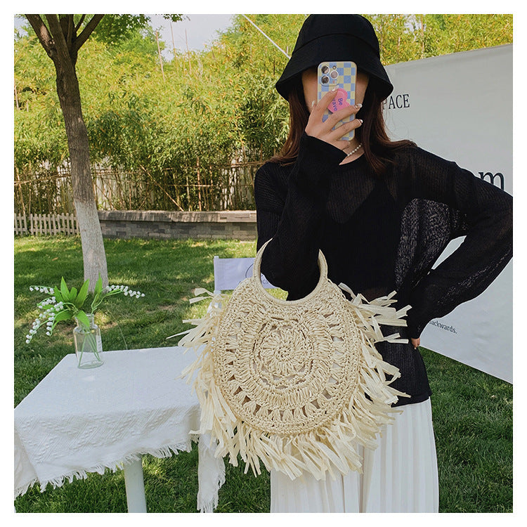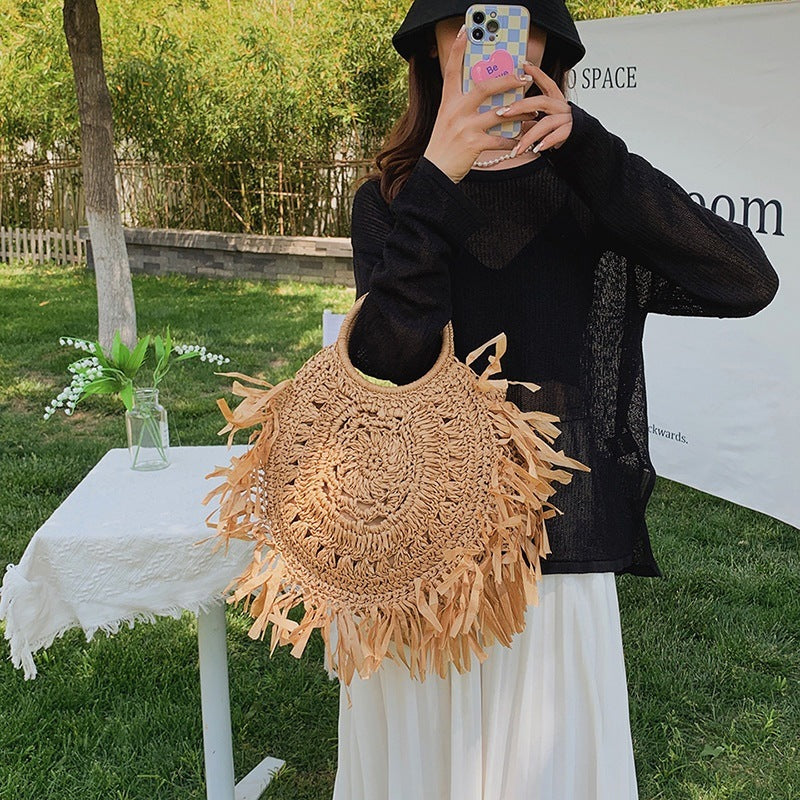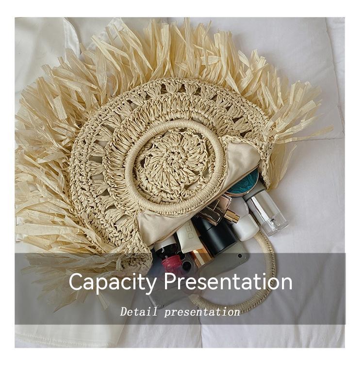 Product information: Lining texture: Polyester Pattern: solid color Color: white, khaki Processing Method: soft surface Outer bag type: Three-dimensional pocket Material: Straw Popular elements: woven, hollow, tassel Number of shoulder straps: Single Lifting parts: hard handle Hardness: medium Suitcase shape: round Package internal structure: mobile phone bag Style: cross-border Fashion Yes/No lining cloth: None