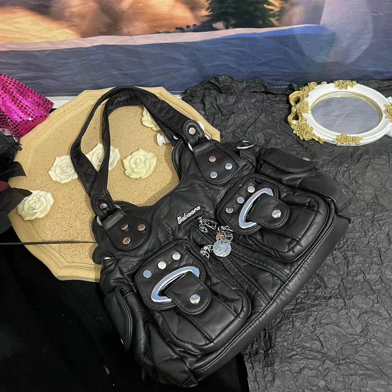 Product information: Texture: PU material Process: soft surface Closure: zipper Pattern: plain Shape: horizontal Color classification: Black rivets, white pockets Internal structure: zipper pocket Size: 29*12*21cm Packing list: Bag *1
