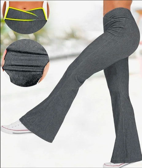 Solid Color High Waist Cross Stretch Denim Casual Sports Bell-bottom Pants