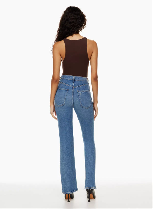 Product information: Thickness: medium Fabric name: denim Color: blue Elasticity: high elasticity Main fabric composition: Cotton Pants length: trousers Waist type: high waist Size: S,M,L,XL,XXL Style type: Street hipster Pants type: straight-leg pants Popular elements: Holes Style: Basic Style: Denim style Process: hand frayed