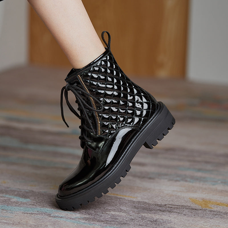 Closing method: front tie Boots name: fashion boots Toe style: round toe Heel style: thick heel Sole Material: Rubber Cortex features: patent leather Shoe making process: Adhesive shoes Insole material: artificial short plush Boot tube surface material: first layer cowhide