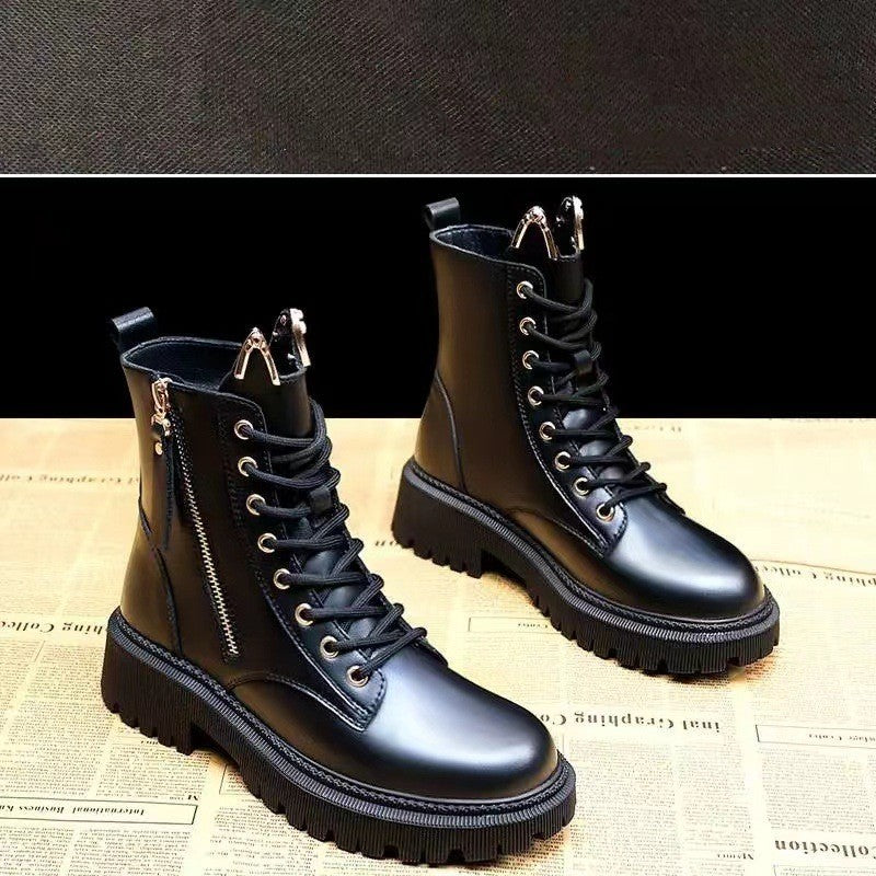 Product information: Pattern: solid color Lining material: cloth Color: Black Spring and Autumn thin, black winter fleece Heel height: mid heel (3-5CM) Socks length: low tube Heel shape: height increase insole Size: 35, 36, 37, 38, 39, 40 Sole craft: viscose shoes Sole material: rubber Popular elements: Metal Thickness: ordinary thickness Toe holder shape: round head Footwear uppers material: two layers of cowhide (except cowhide) Wearing method: side zipper Applicable Gender: Female