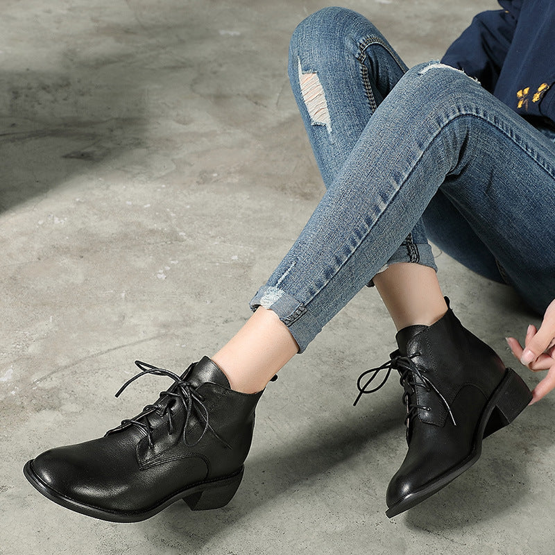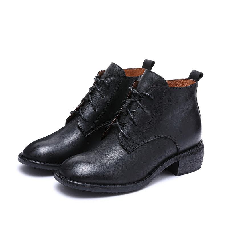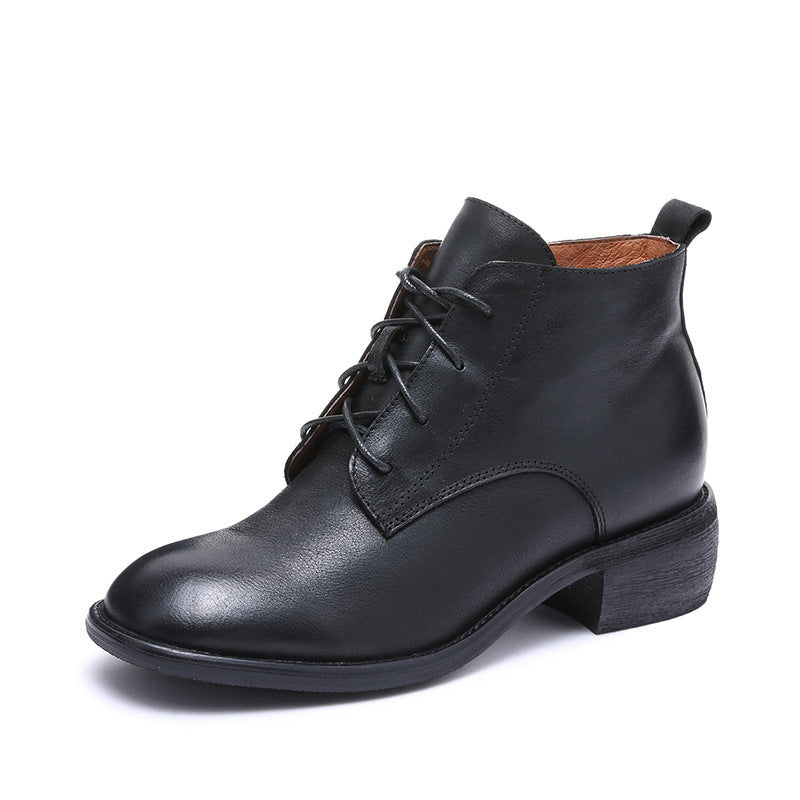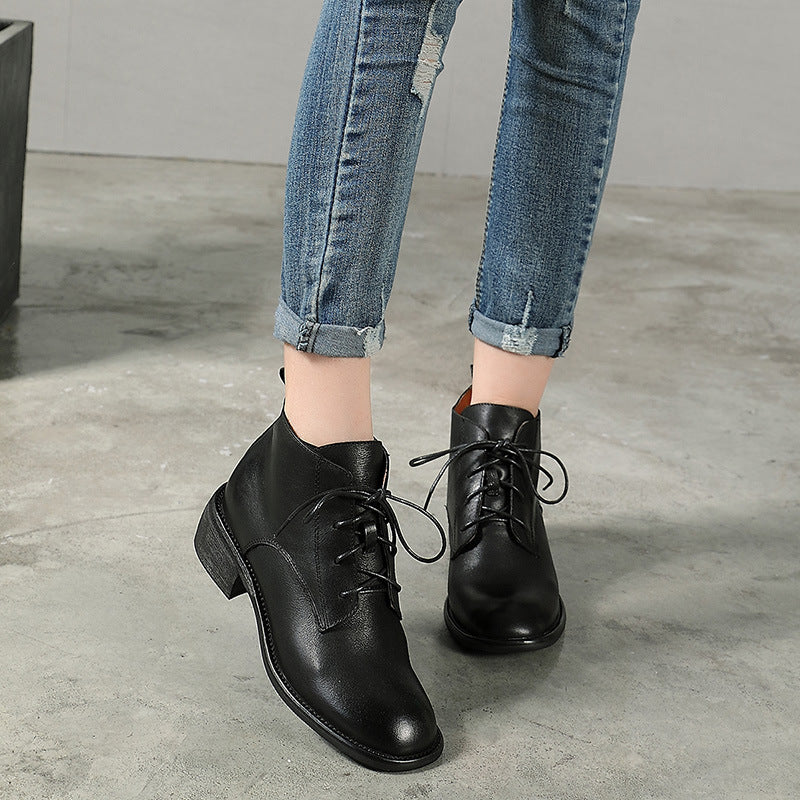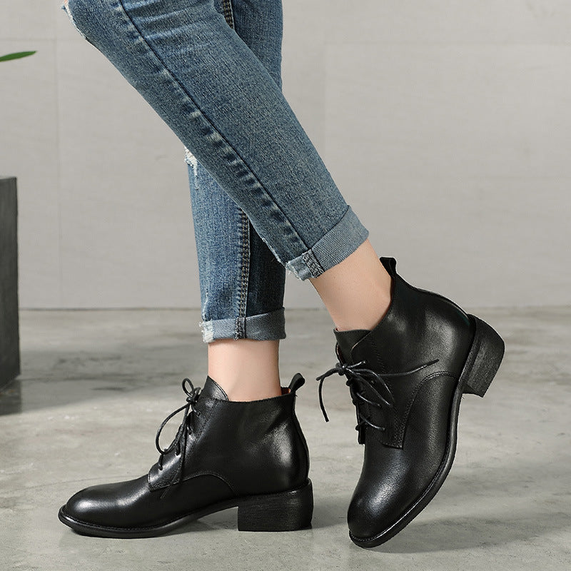 Upper material: leather Sole Material: Rubber Applicable gender: female Cortex features: cowhide Processing method: paint surface Style: Vintage Toe shape: round toe Heel shape: thick heel Heel height: middle heel (3-5CM) Popular boots: Martin boots Popular elements: car stitching, leather stitching, waterproof platform Function: shock absorption, warmth, wear resistance, wrapping, non-slip Tube height: low tube Thickness: ordinary thick Wearing style: front tie pattern: plain Suitable season: Spring, Autumn, Winter
