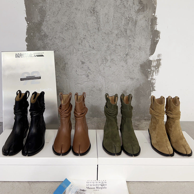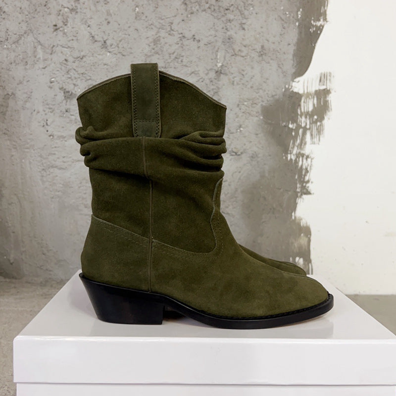Product information: Product Category: Fashion boots Upper material: first layer cowhide Sole material: leather Style: Street Toe shape: round head Heel shape: horseshoe heel Popular boot style: Cowboy boots Popular element: Leather stitching Function: increase, wrap Barrel height: Middle barrel Thickness: normal thickness Color: Brown suede, black suede, apricot suede, Army green suede