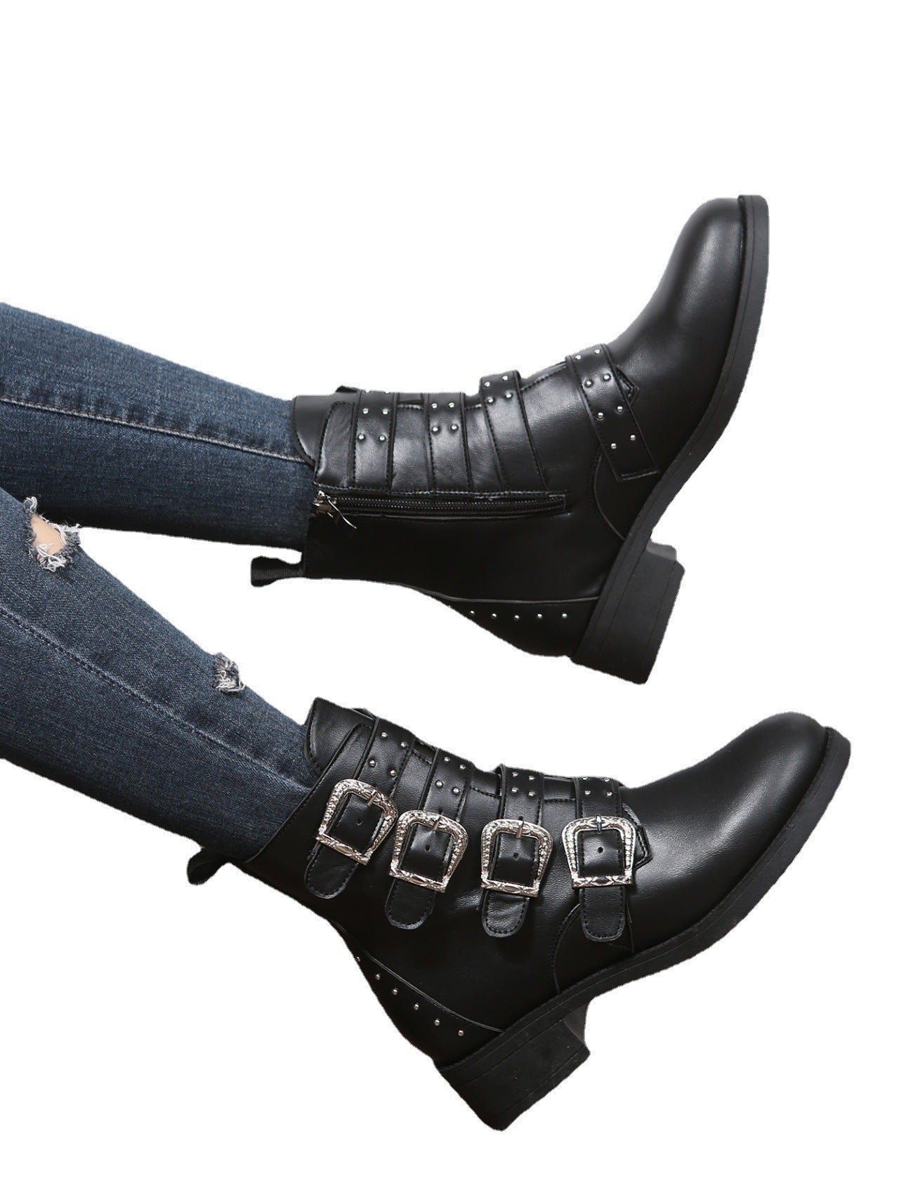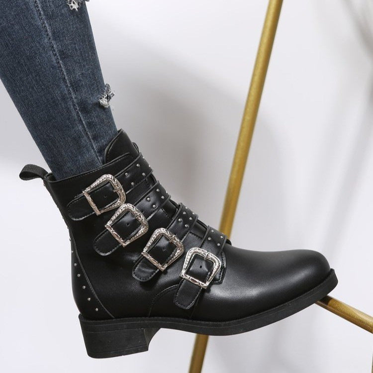 Women's Fashion Belt Buckle Flat Heel Mid-calf Chunky Heel Round Head Dr Martens Boots