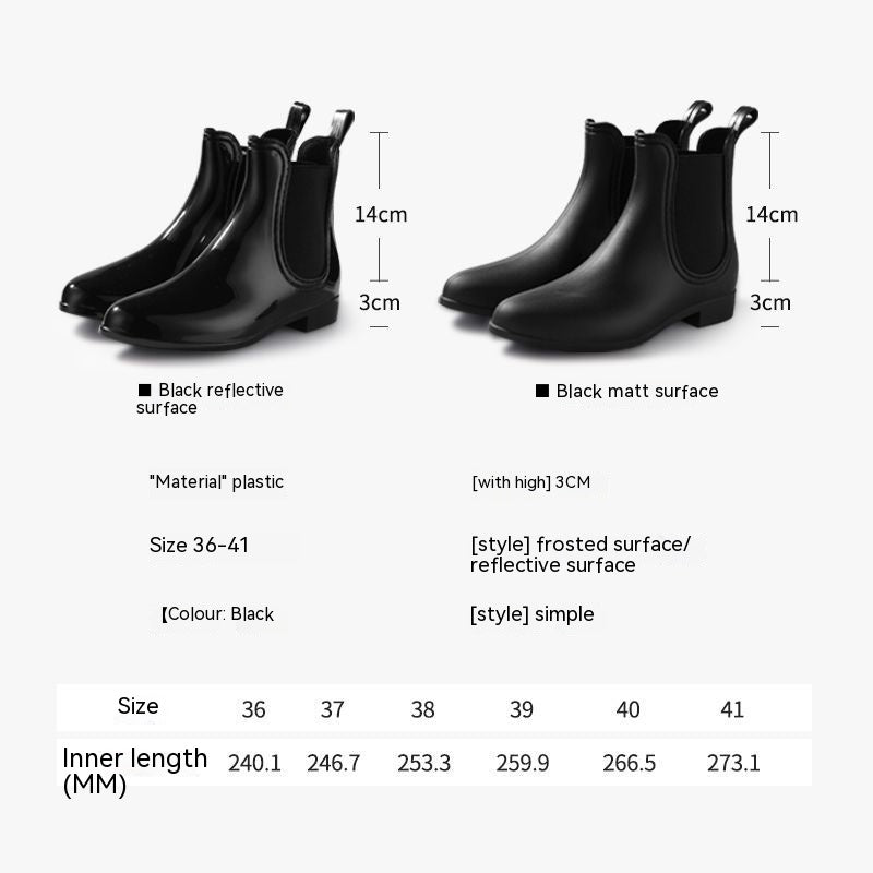 Product information: Pattern: solid color Color: matte black, greyish black Heel height: low heel (1-3CM) Socks length: low tube Size: 36, 37, 38, 39, 40, 41 Thickness: ordinary thickness Shoe Upper material: PVC Applicable Gender: Female Applicable age: Adult Suitable season: Can be worn in all seasons