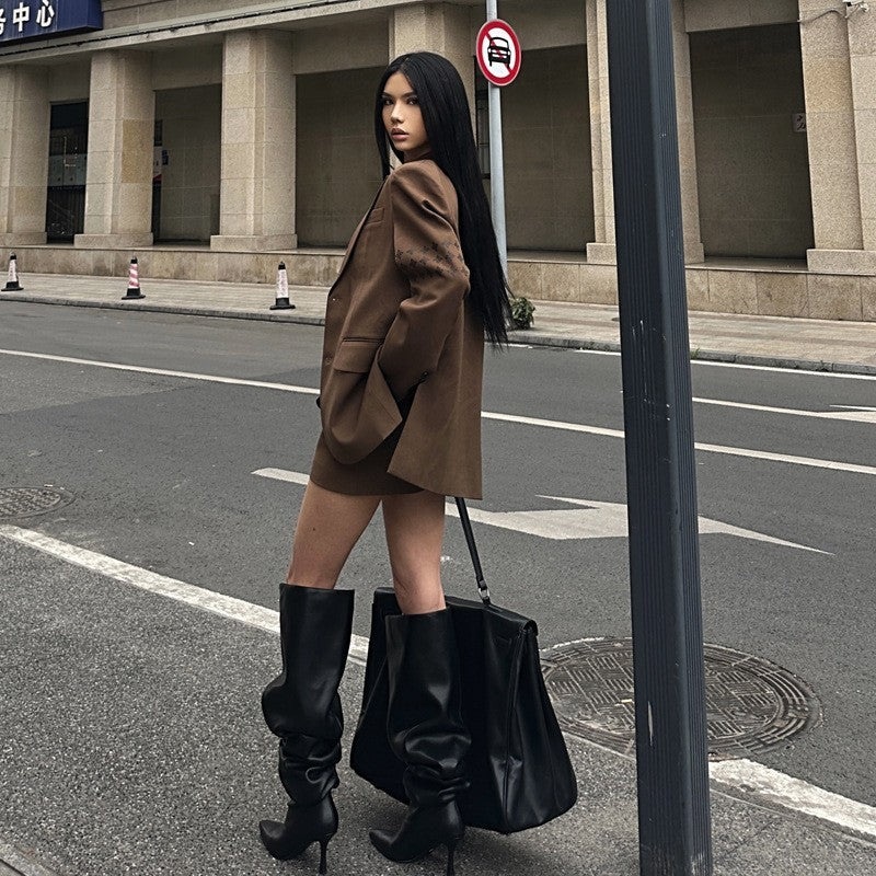 Product information: Lining material: Leather Color: Black Length of socks: beyond the knee Heel shape: stiletto heels Size: 35, 36, 37, 38, 39, 40 Sole material: rubber Toe bracket shape: Tip Shoe Upper material: Microfiber Wearing method: oversleeves/shoe covers