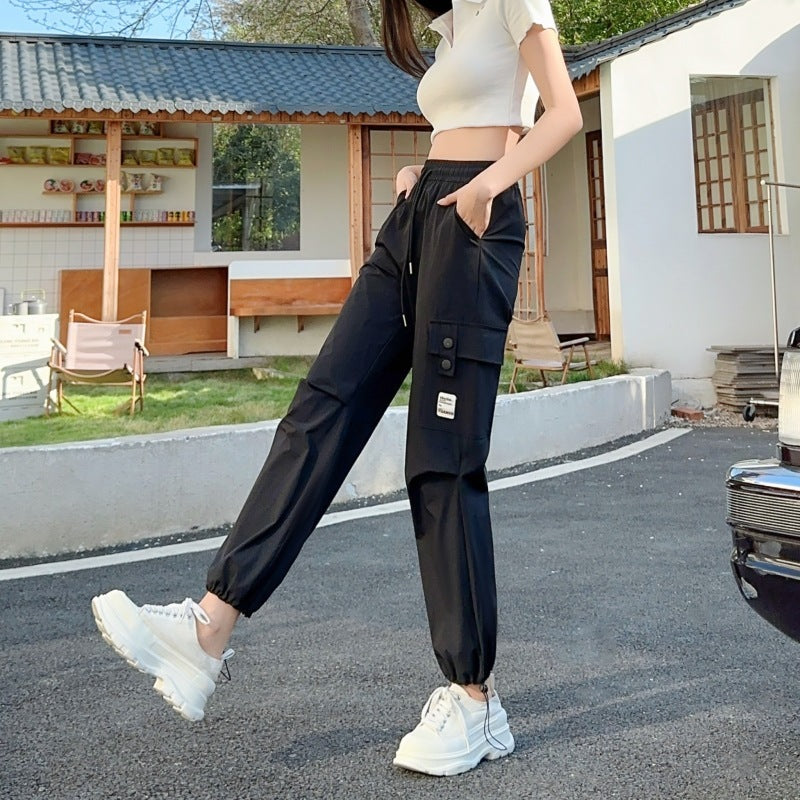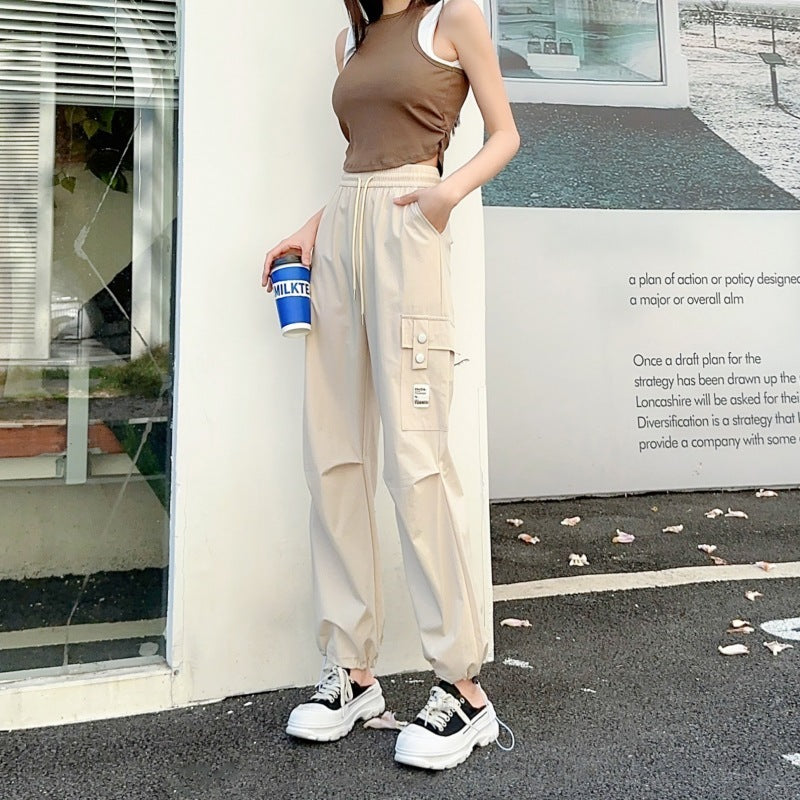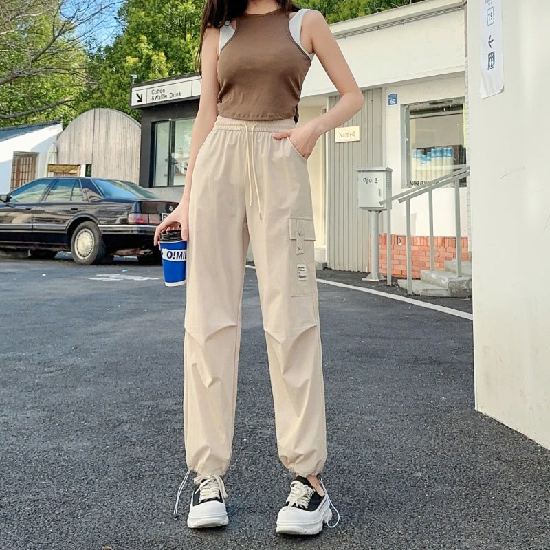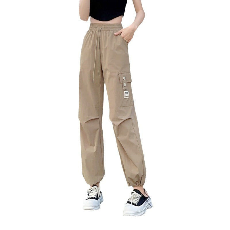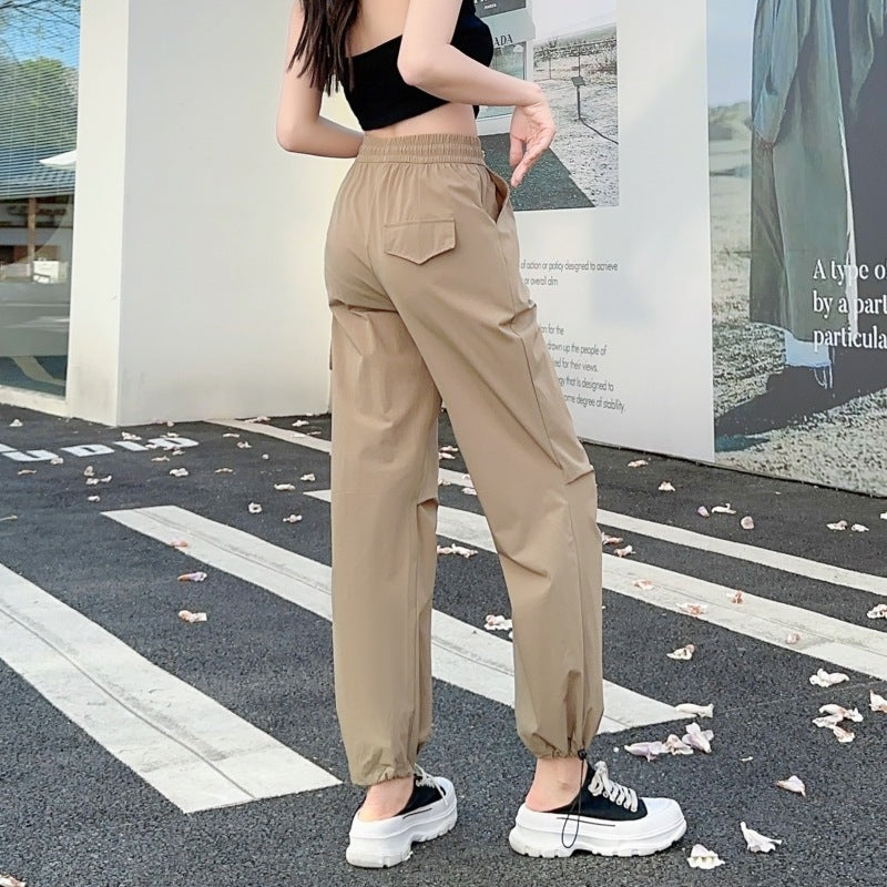Product information: Thickness: thin Fabric name: brocade cotton quick-drying cotton Color: apricot, khaki, Black Elasticity: Micro elasticity Main fabric composition: Nylon Pants length: trousers Waist type: elastic waist Style type: street fashion Pants type: straight-leg pants Popular elements: Pocket Style: work clothes Style: tooling style Process: high temperature stereotypes