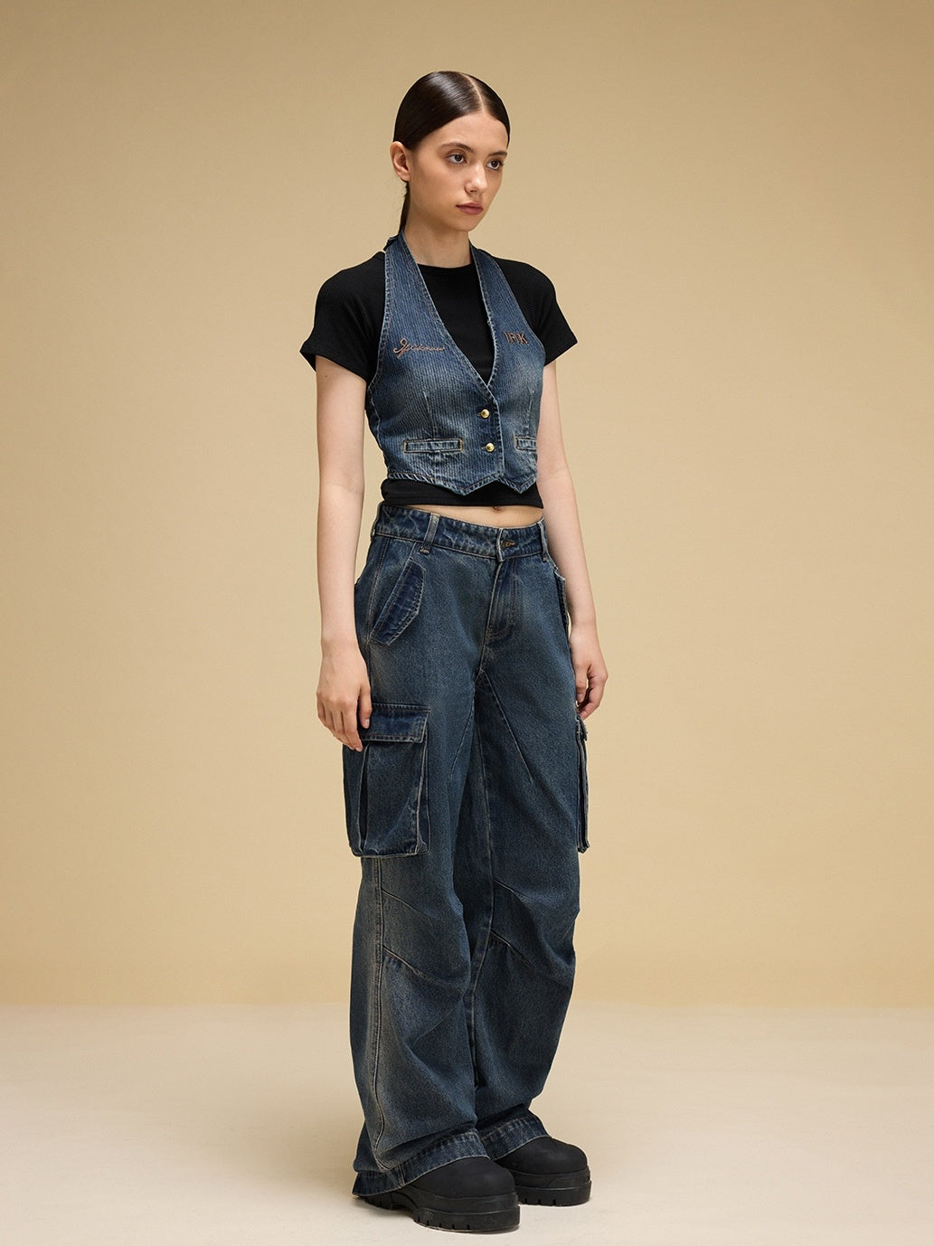 Product Details: Craftsmanship: Multi-pockets Waist type: low-waist Pants placket: zipper Length: trousers Color classification: dark blue Size information: Size: I0(XS) I1(S) I2(M) I3(L)