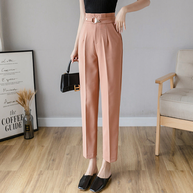 Product information: Supply category: spot Style: OL commuting Style: pencil pants/foot pants Pants type: loose type Pants length: Nine pants Waist type: high waist Is there a belt: There is a belt Thickness: Thin section Popular elements: other Color: green, black, pink Suitable age: 18-24 years old Style type: temperament commuting Size information: Size: S, M, L, XL