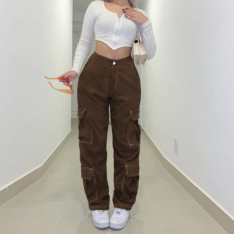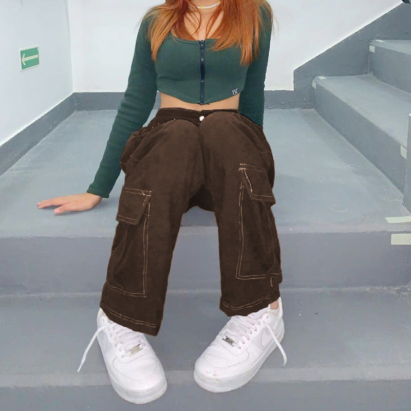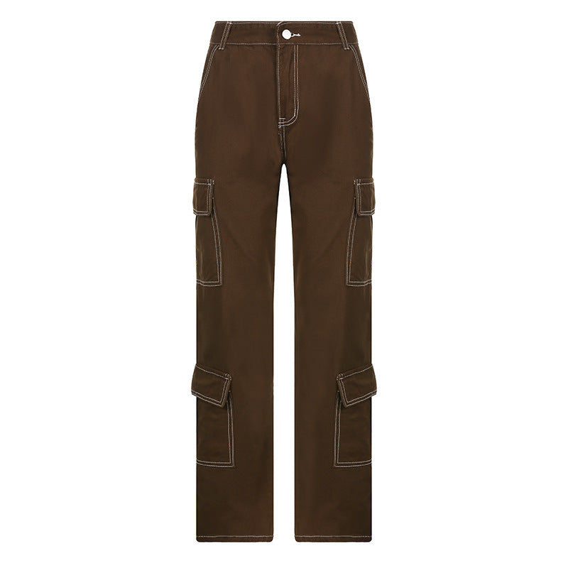 Women's Brown Straight Pants Cargo Style Multi Pocket Retro Low Waist