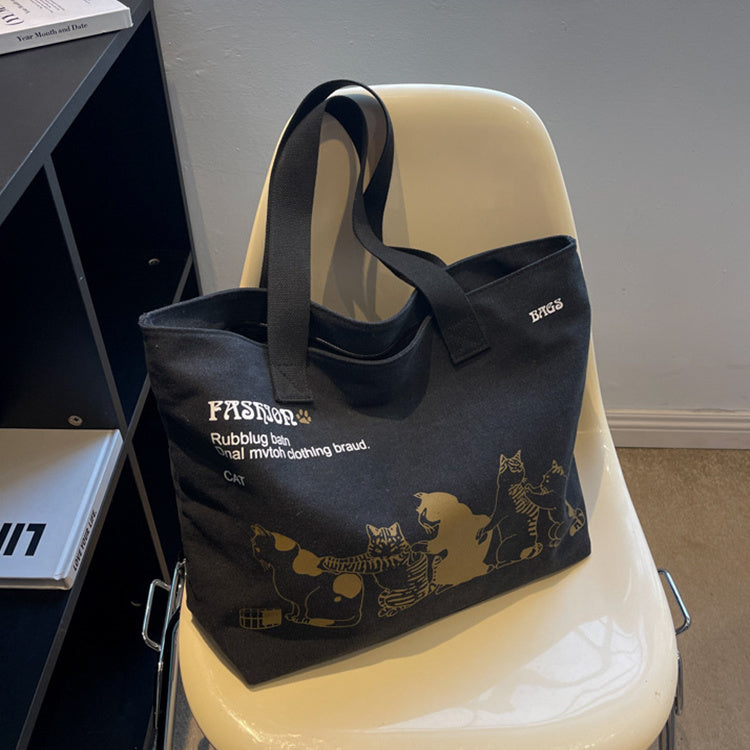 Cute Cartoon Cat Printed Canvas Bag Large Capacity Fashion Shopping Shoulder Bag Student Campus Handbag
