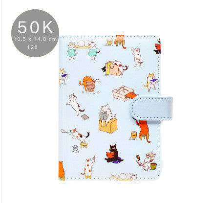 32K size: 12.8 x 18.6 cm 50K size: 10.5 x 14.8 cm Number of sheets: 128 sheets Inside pages: blank color pages & horizontal pages with black and white illustrations Material: PU cover + high quality inner page paper Color inner core, can be arbitrarily classified, recorded, graffiti The inner pages do not hurt your eyes, environmentally friendly ink, cute illustrations, and smooth writing Snap cover and pen holder for easy carrying
