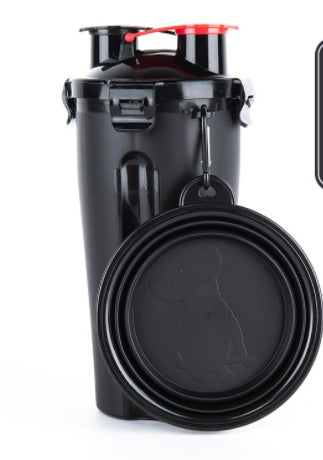 2-in-1 Dog water bottle and dog food storage container with two collapsible dog bowls, and two hooks on the bottle for us to hang the folding bowl.