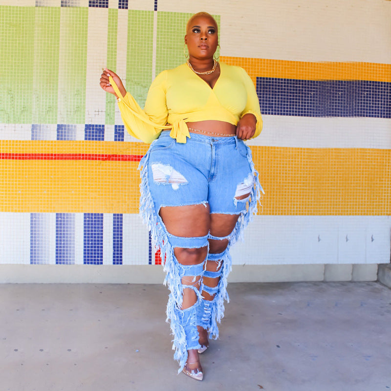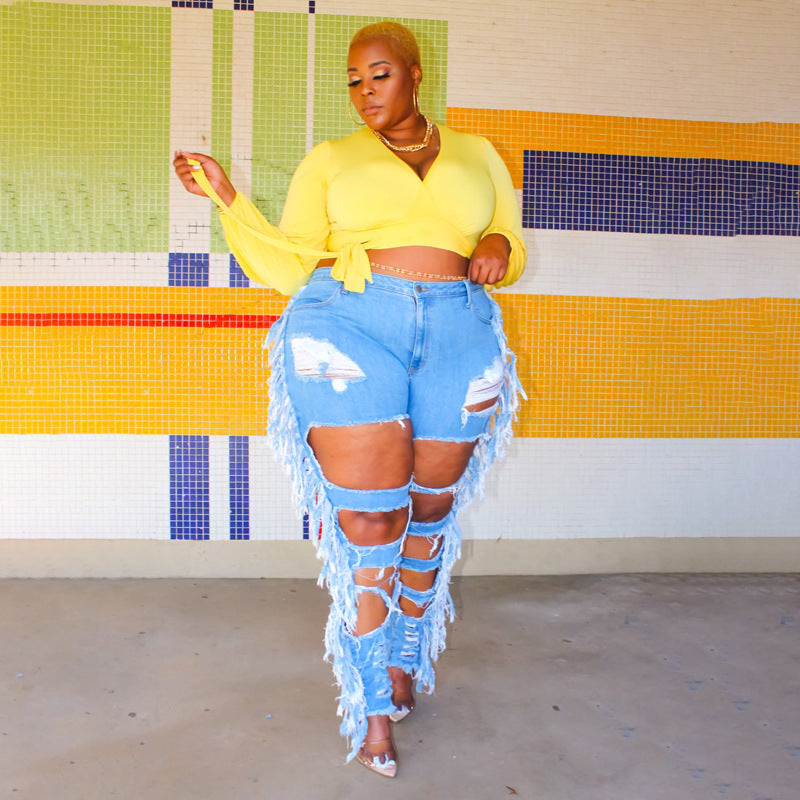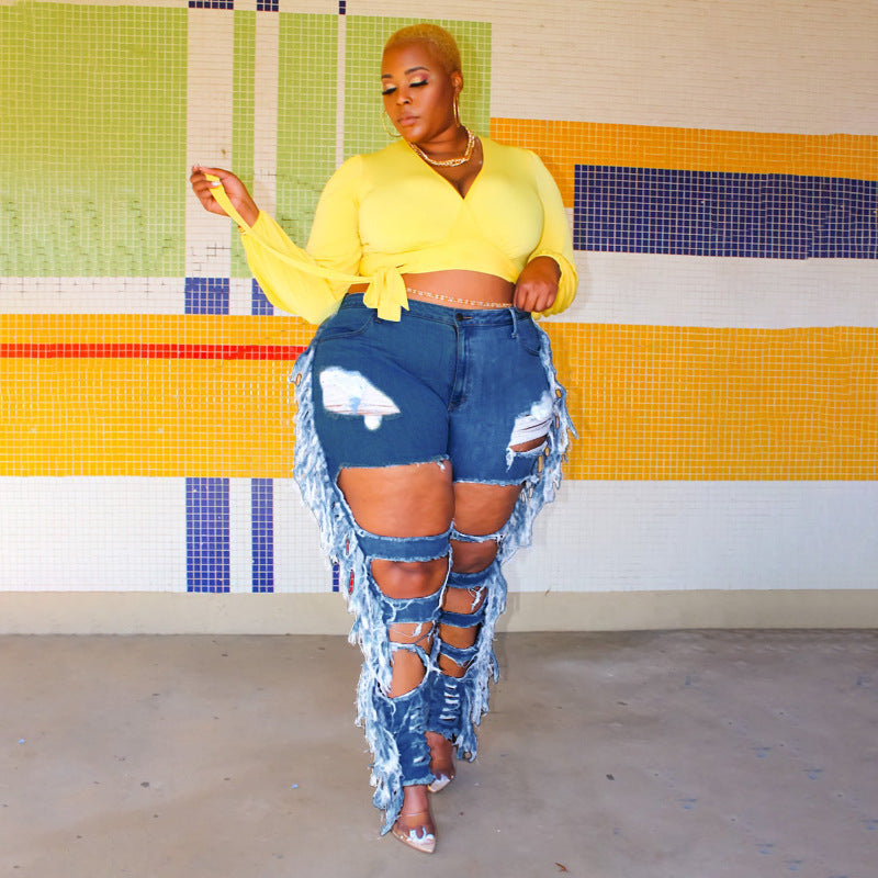 Adogirl Plus Size Side Tassel Holes Jeans Pencil Pants Women Sexy Distressed Hollow Out Tight Denim Trousers Fashion Streetwear