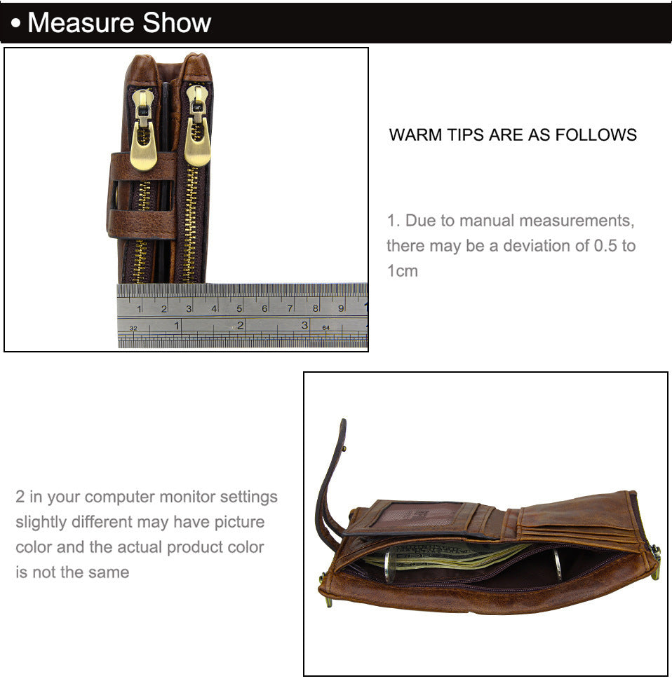 SIZE : 12.1CM* 9.4CM*2.7CM HARDWARE :Metal zipper MAIN MATERIAL : Genuine leather CAPACITY :nterior slot pocket,coin pocket,note compartment,photo holder,card holder LINING : polyester