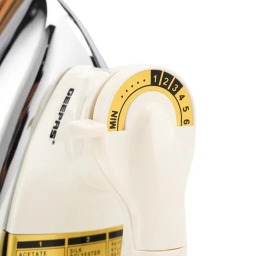The Geepas Dry Iron GDI23011 combines professional-grade performance with everyday convenience. Its thermostatic pilot lamp keeps you informed of operational status, while the intuitive temperature dial delivers perfect results on every fabric type. The premium 60-micron Teflon-coated soleplate glides effortlessly across garments without sticking, ensuring flawless finishes. Built for durability and safety, this heavyweight iron features automatic cut-off protection and overheating safeguards. The convenient heel rest provides hands-free storage, while the fabric guide simplifies temperature selection. An interchangeable cord with wrap facility keeps your workspace organized. Rated 1000-1200W at 220-240V, 50/60Hz, this iron delivers consistent heat for superior ironing results every time.