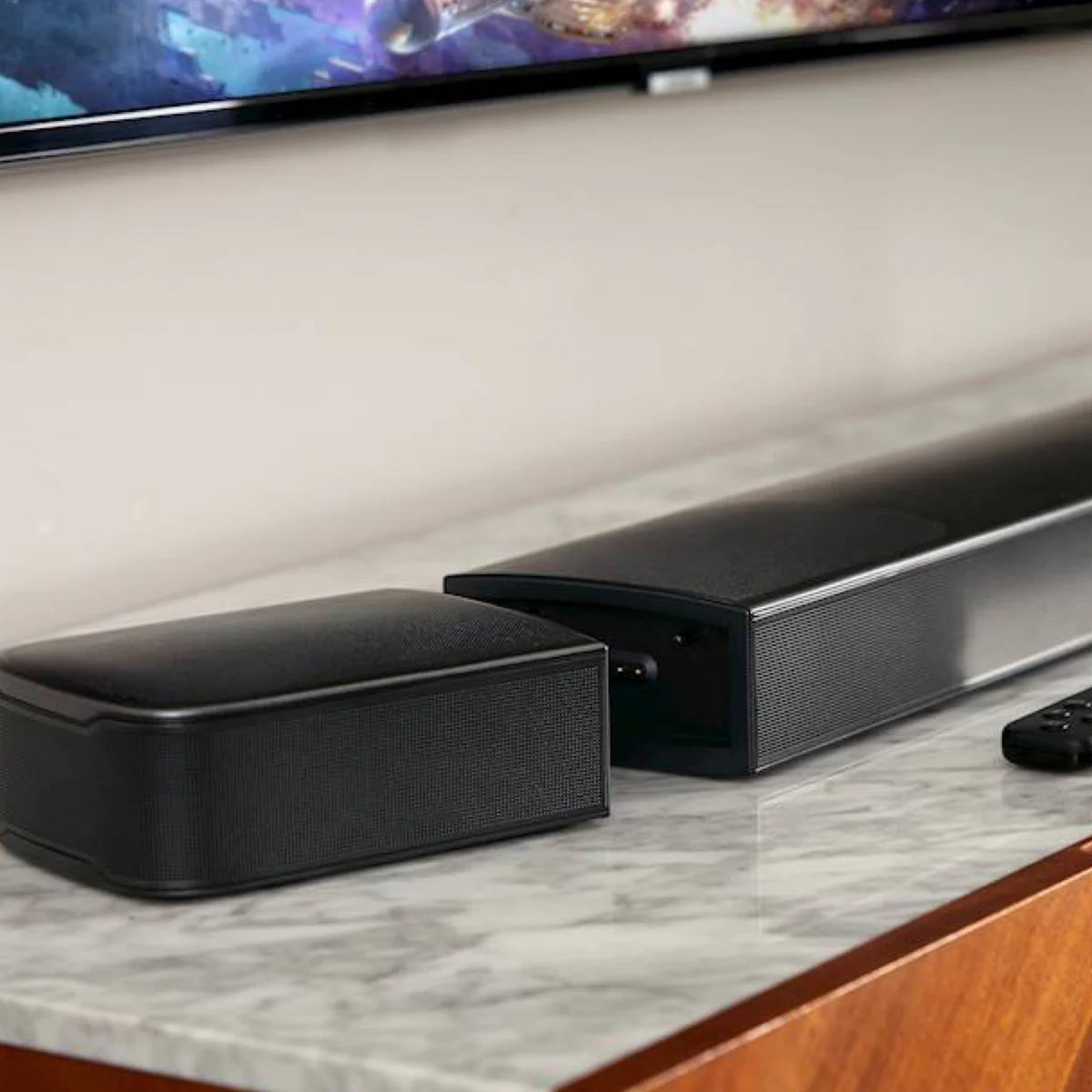 • Built-in batteries mean audio freedom. Place the two detachable surround speakers anywhere in your room to enjoy an incredible audio experience. After up to 10 hours of playback, simply dock them to the soundbar to recharge.