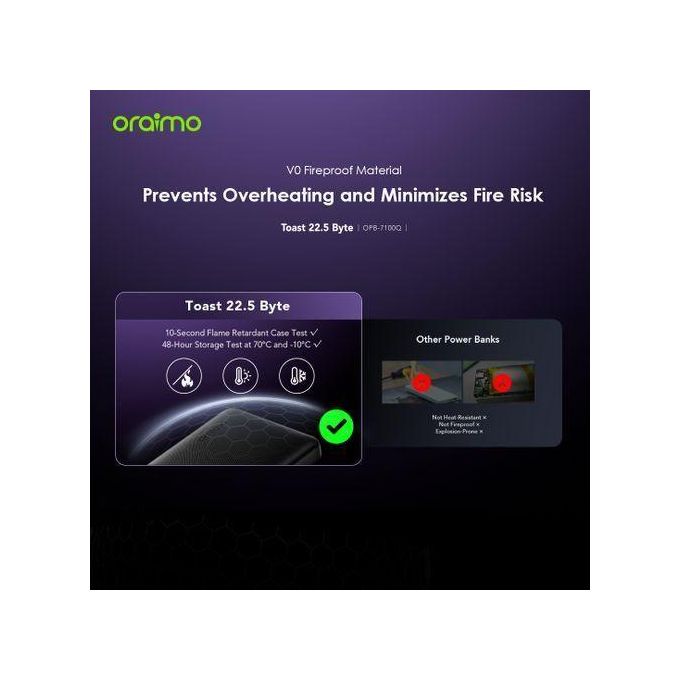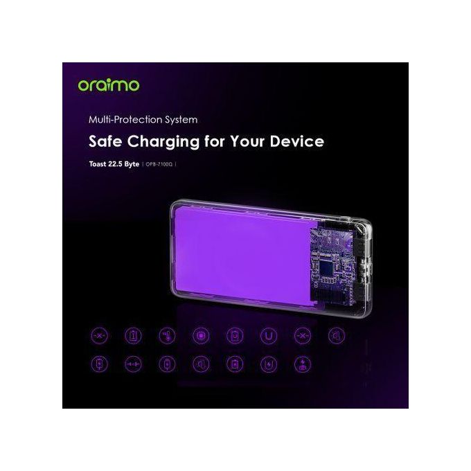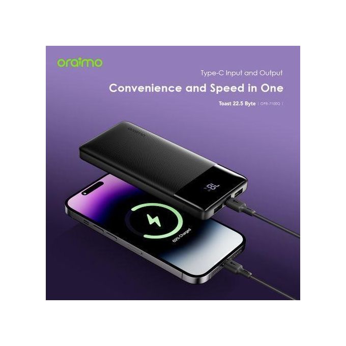 The Oraimo Power Bank 10000mAh Toast delivers lightning-fast charging with 22.5W output, powering both your phone and PC simultaneously. Its 130W Type-C capability recharges to full capacity in just 1.5 hours, keeping you ahead of the day. The smart digital display tracks your battery status at a glance, while the included 100W Type-C cable and travel pouch ensure you're always ready to go. Compact, powerful, and built for your mobile lifestyle.